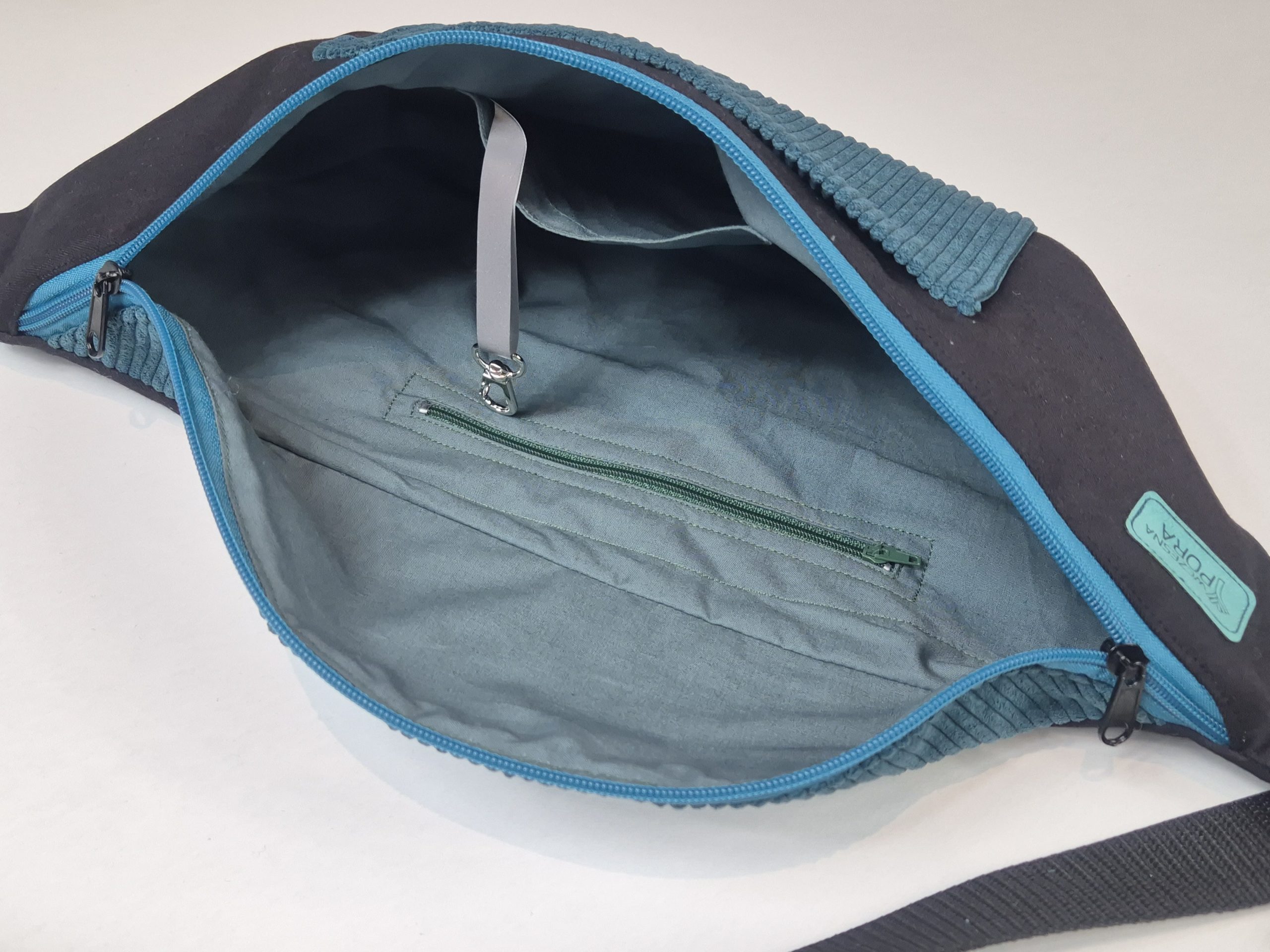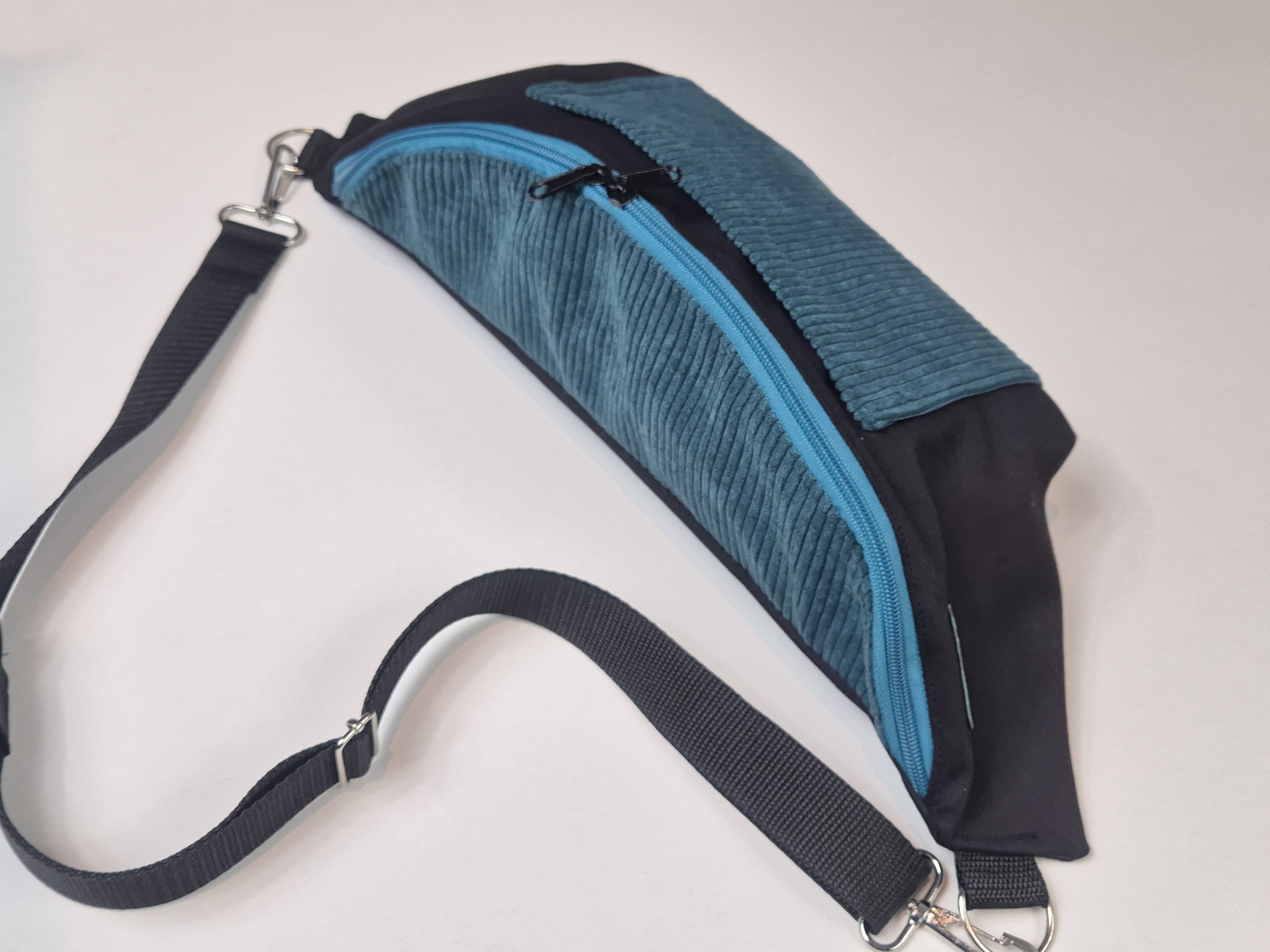 Uszyta z czarnego jeansu (przód i tył) oraz turkusowego sztruksu (góra i zewnętrzna kieszonka)