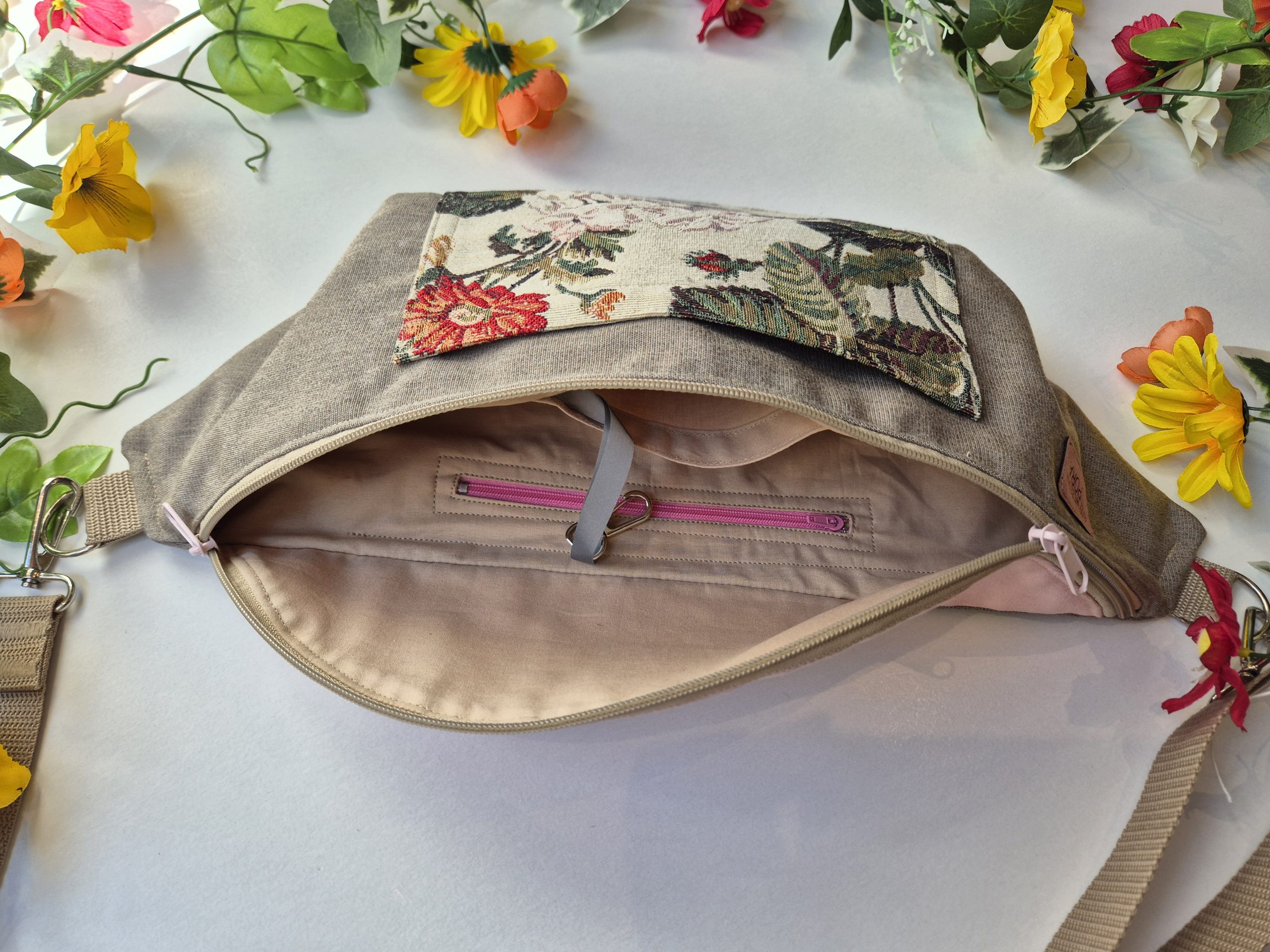 Na zewnątrz kieszonka z beżowego żakardu w kwiaty