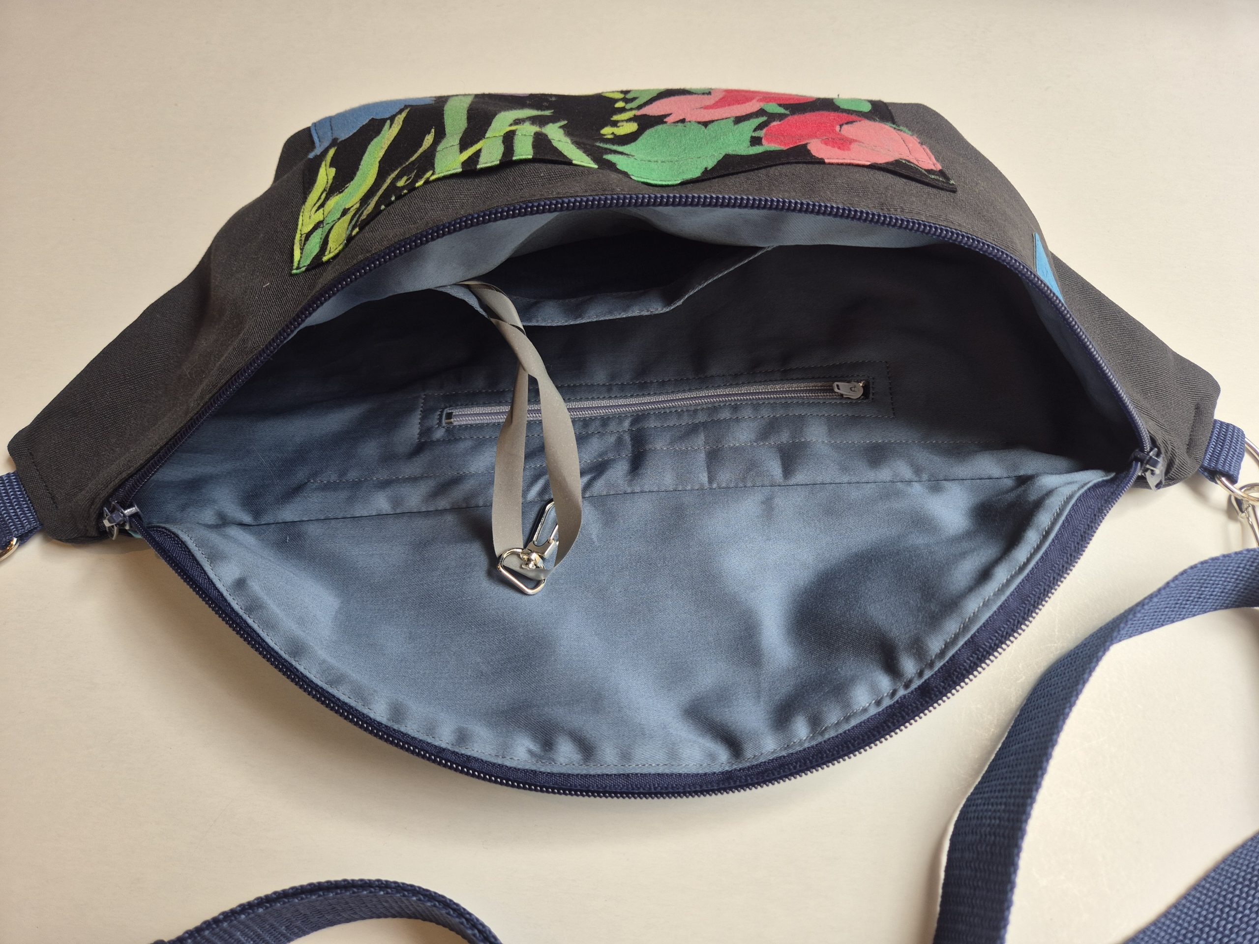 Na zewnątrz kieszonka z kwiatami malowanymi na czarnym tle