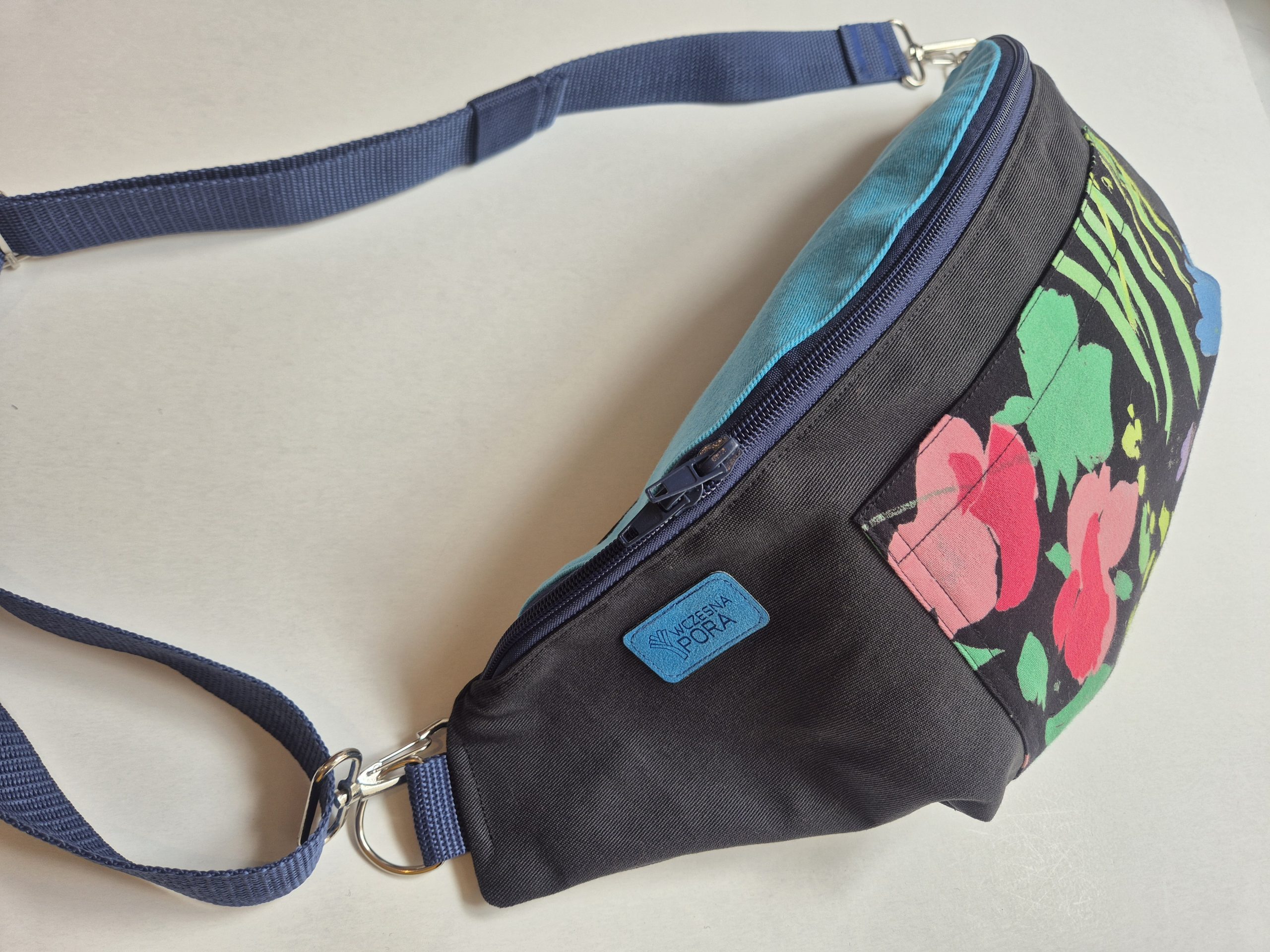 Duża nerka grafitowo-niebieska z kieszonką w malowane kwiaty