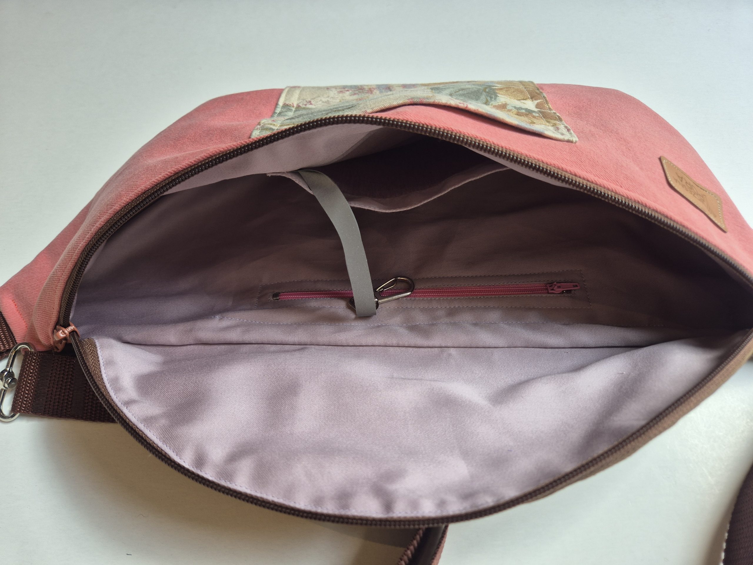 W środku jasno-różowa podszewka + dwie dodatkowe kieszonki.