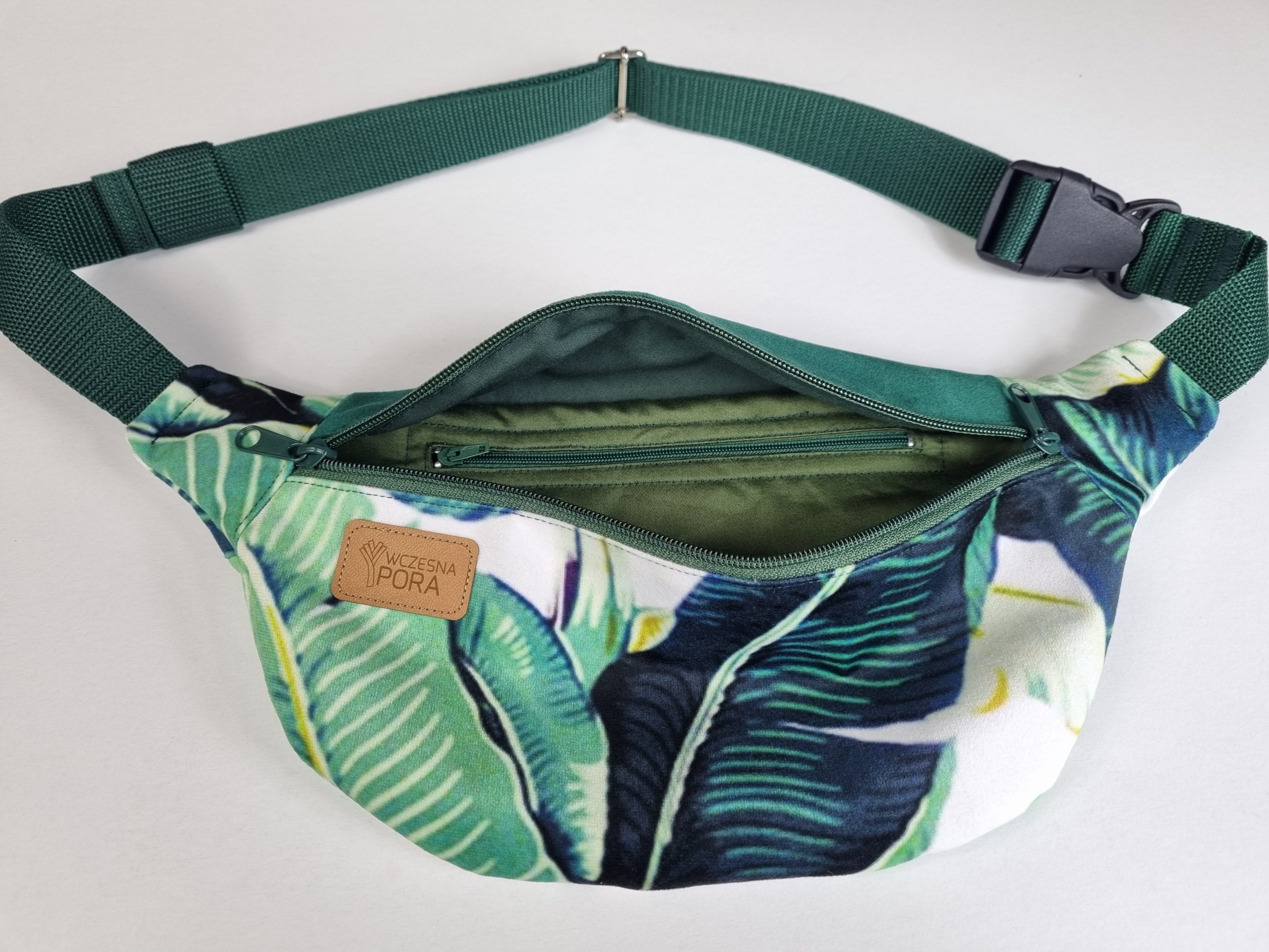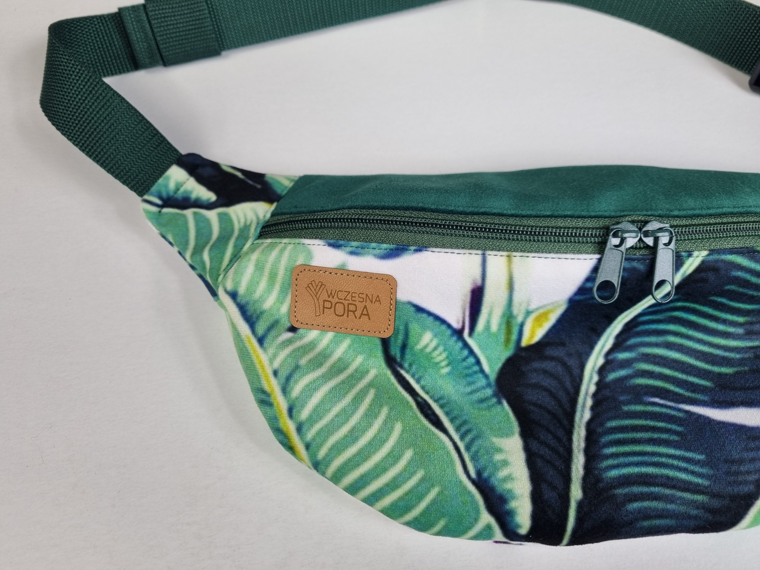 Uszyta z połączenia miłych w dotyku i ciepłych materiałów: butelkowo zielonego weluru i weluru z motywem liści bananowca