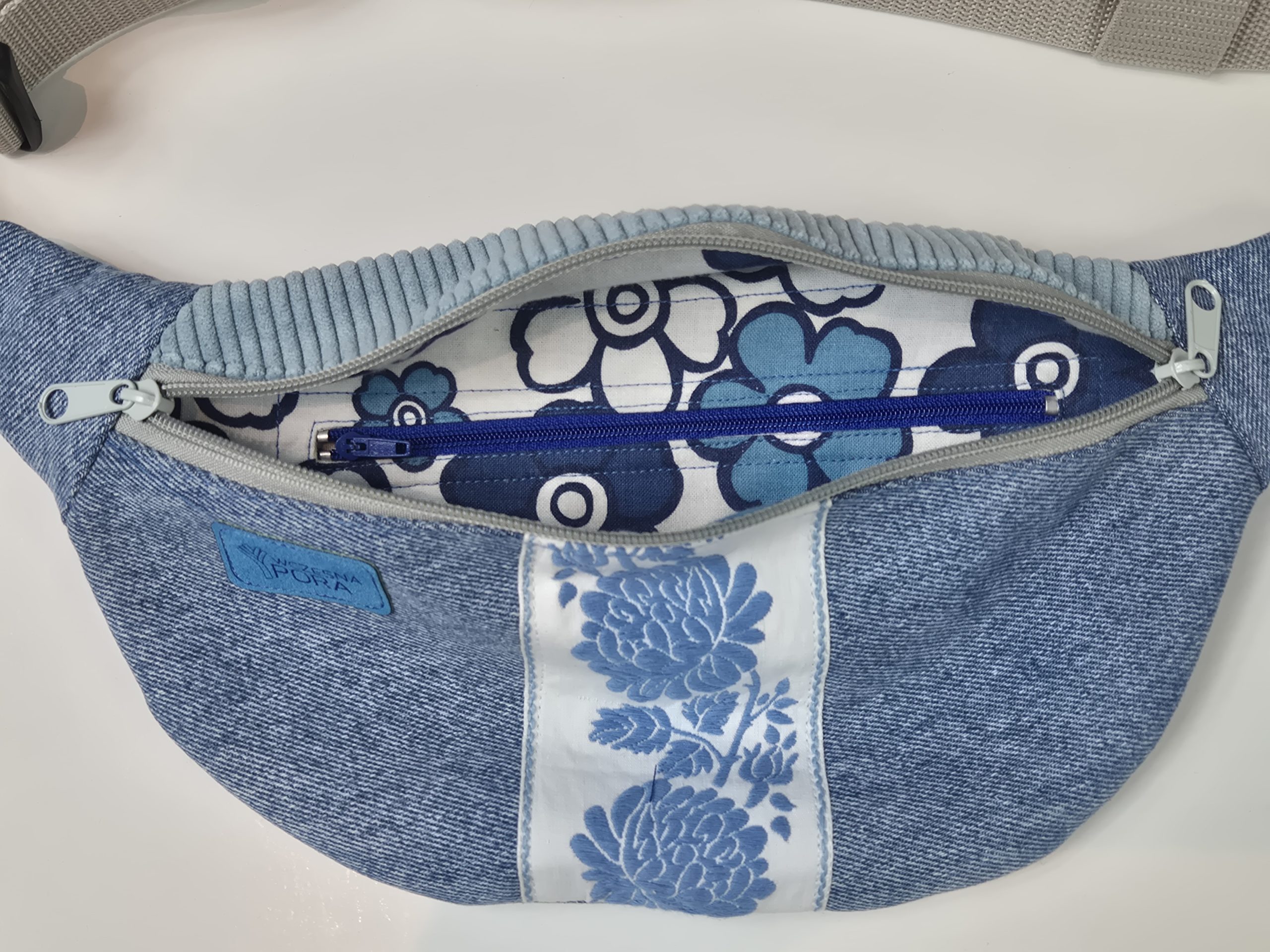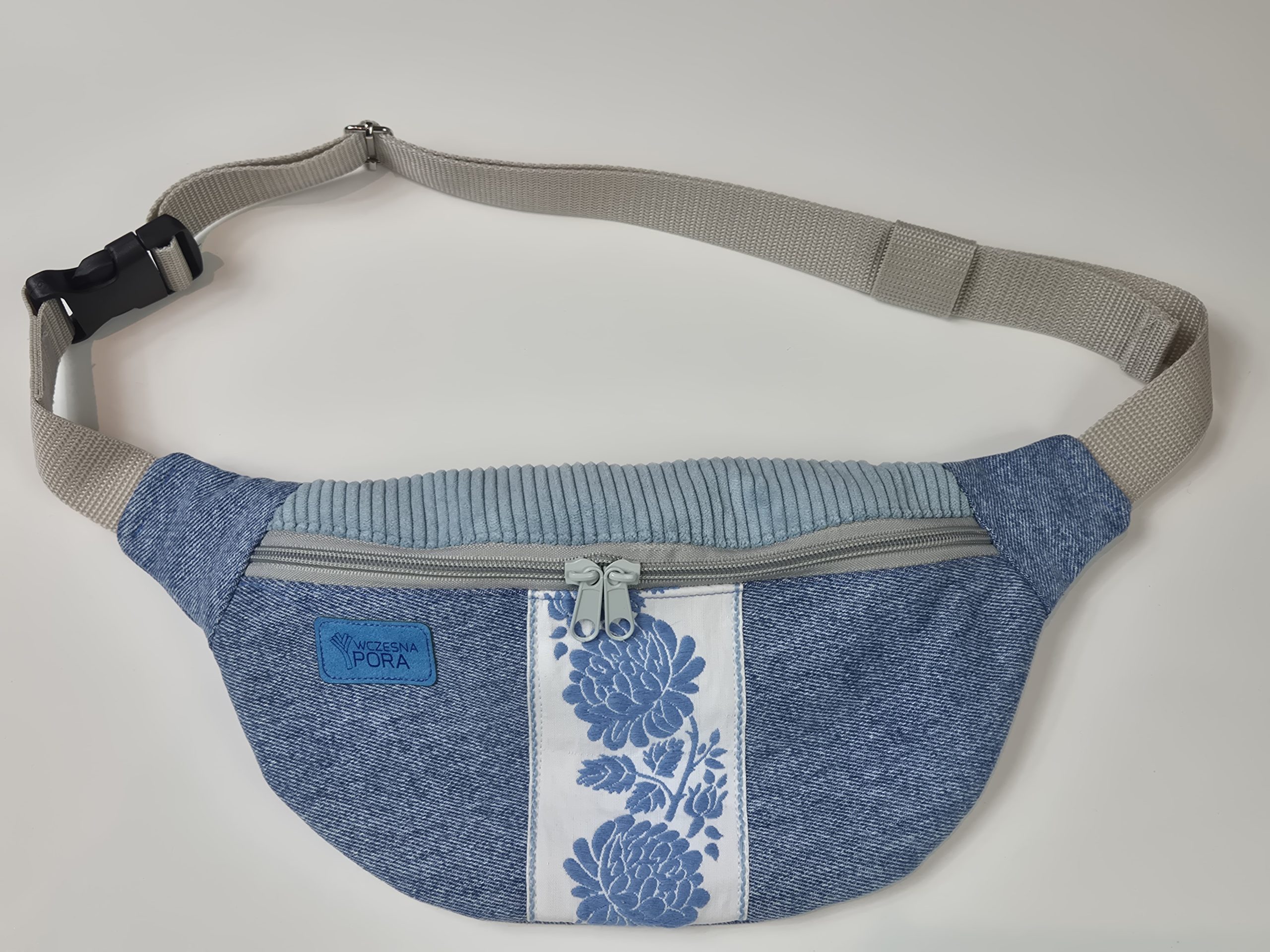 Małej wielkości nerka uszyta z jasnoniebieskiego jeansu z haftowaną, kwiecistą tasiemką, góra nerki z błękitnego sztruksu.