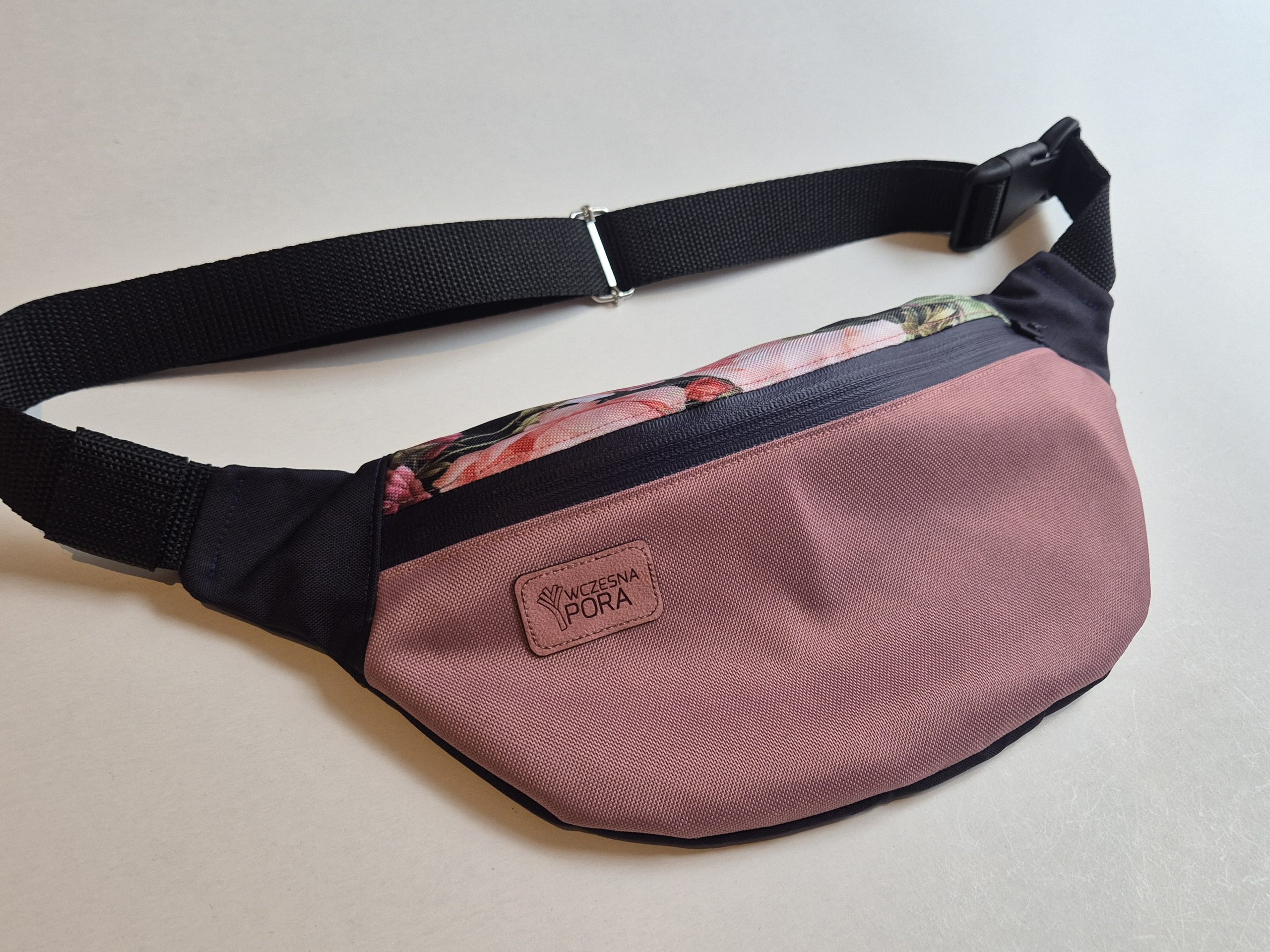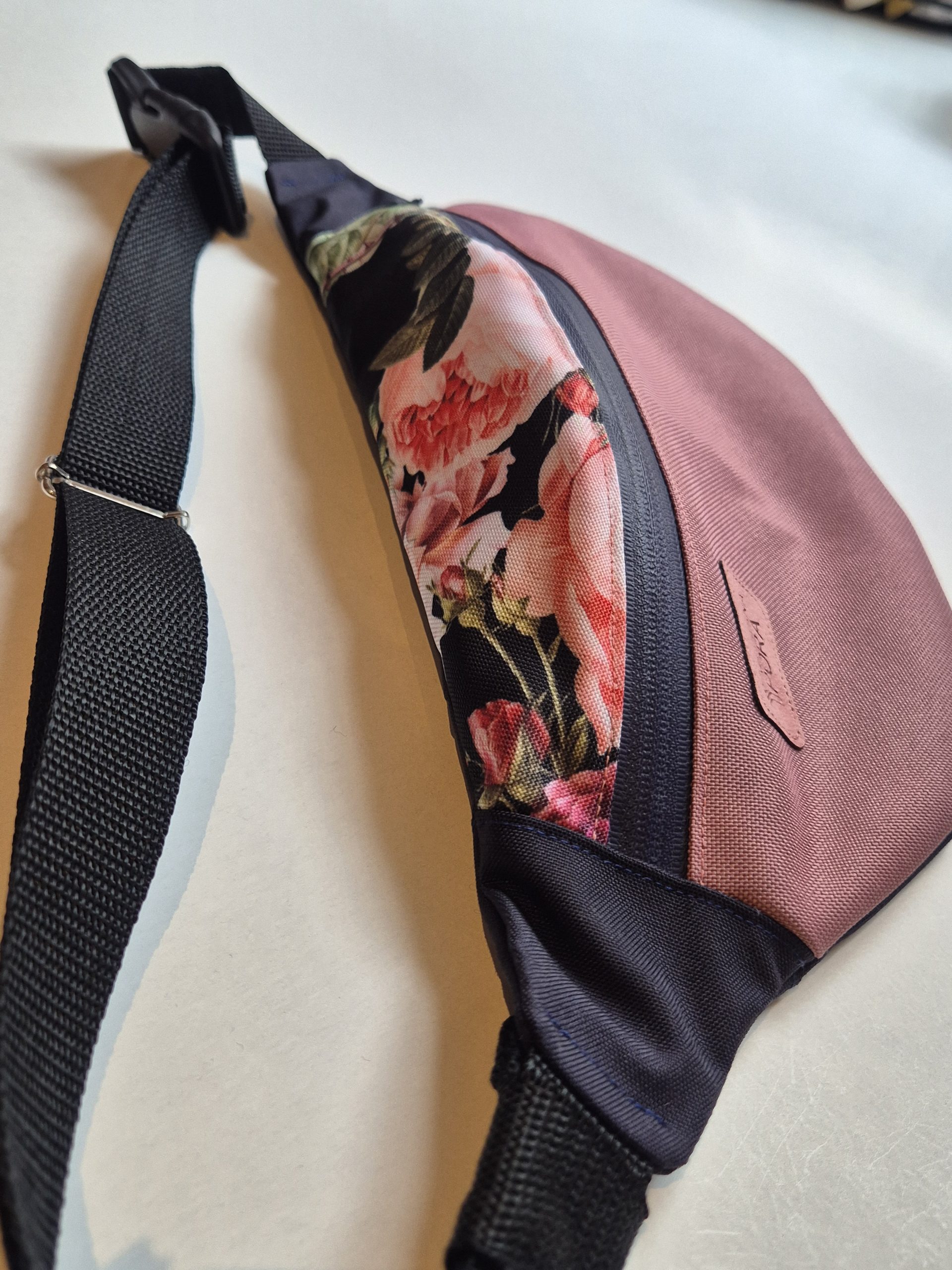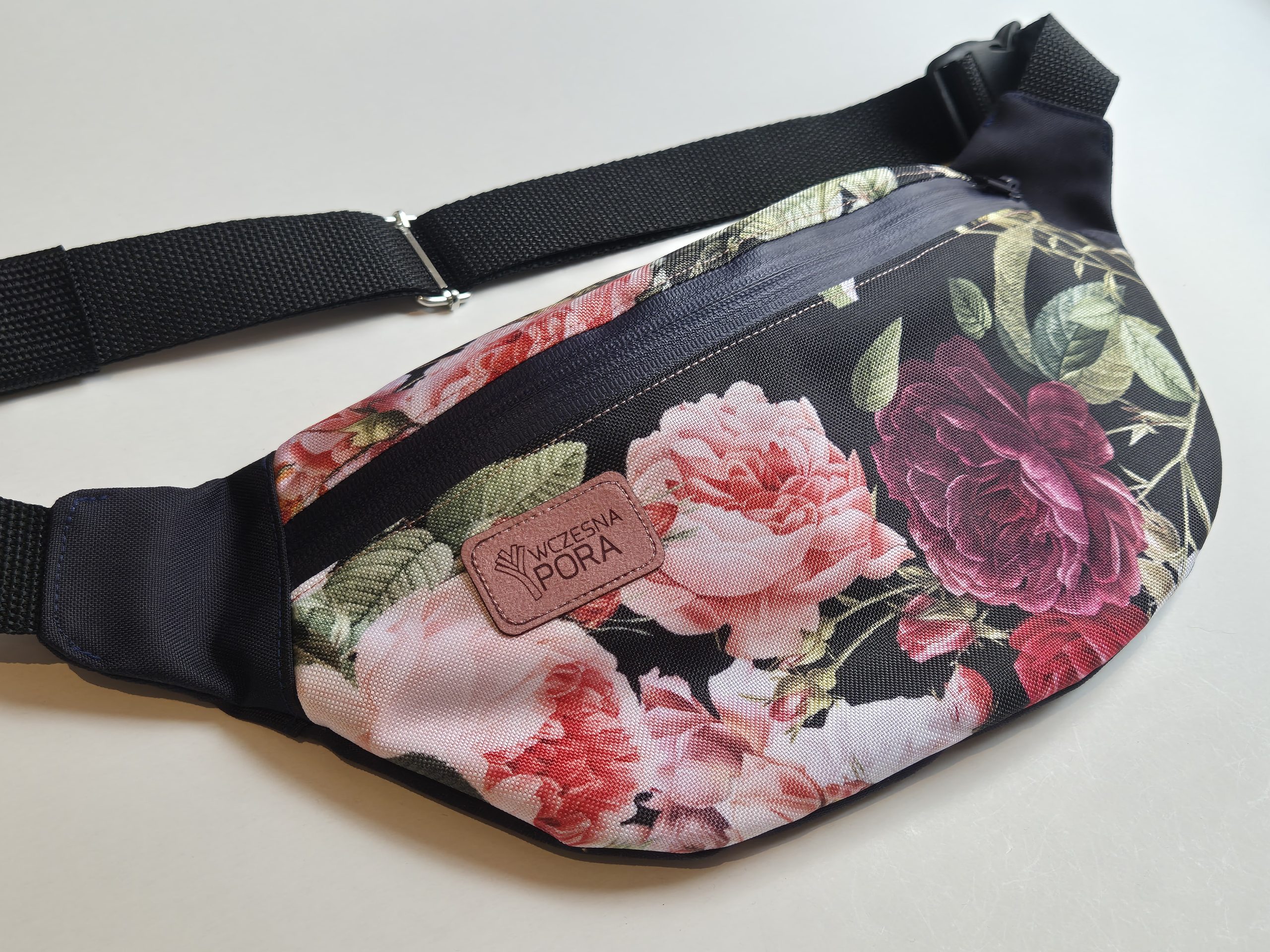 Mała nerka uszyta tkanin wodoodpornych, poliestrowych: różowej, granatowej oraz czarnej z różanym printem.