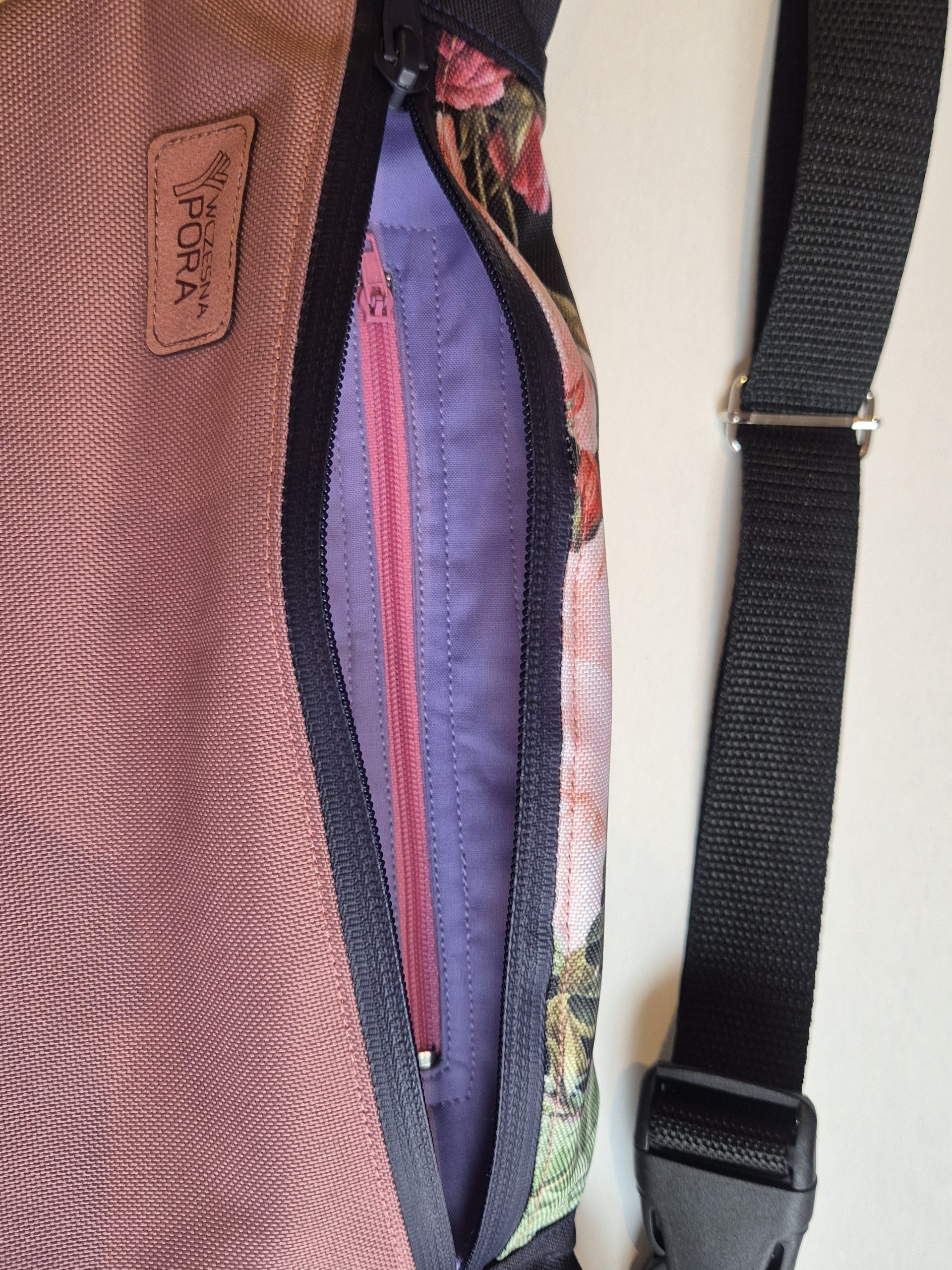 W środku fioletowa podszewka + dodatkowa kieszonka zamykana na suwak.