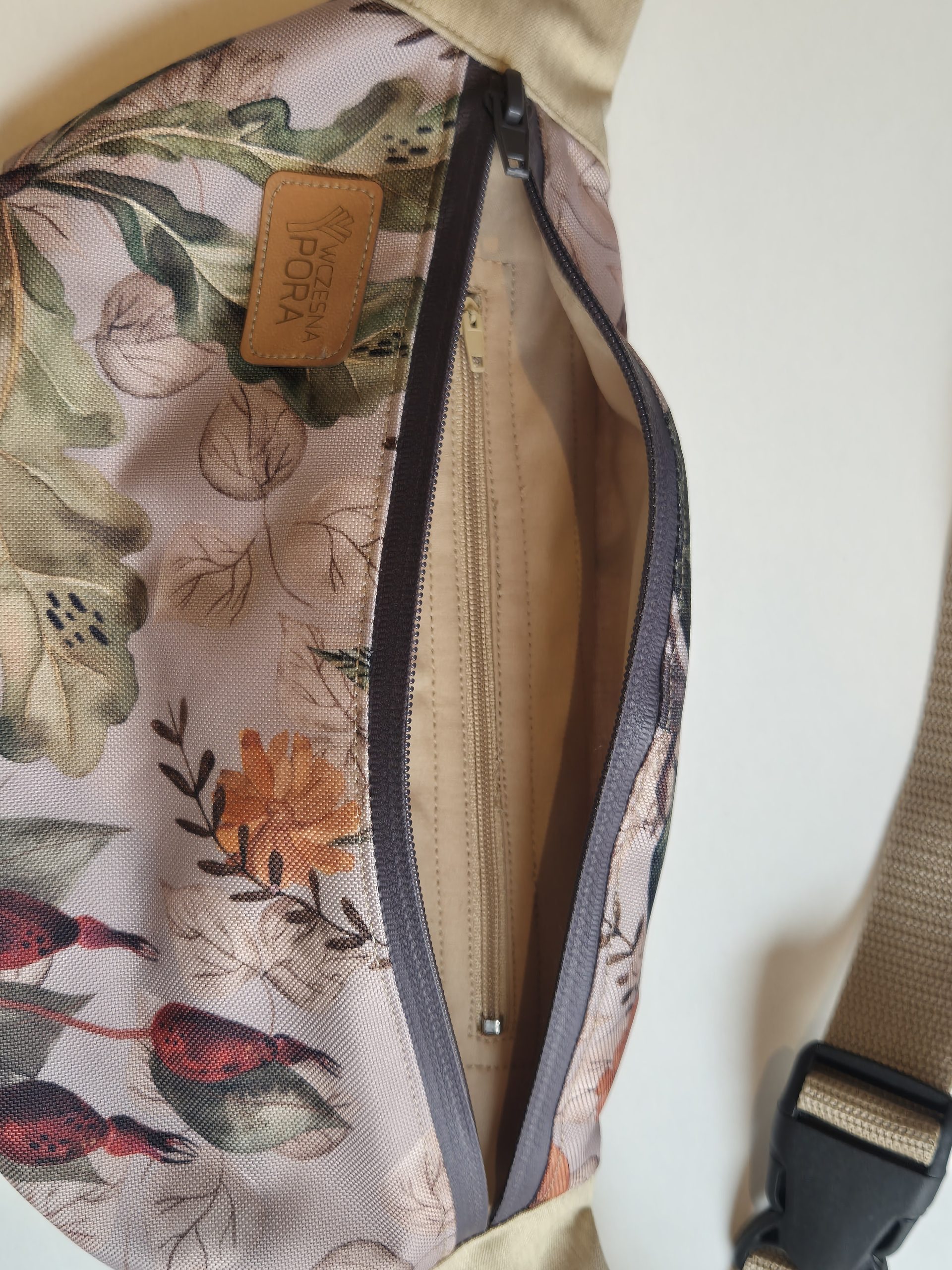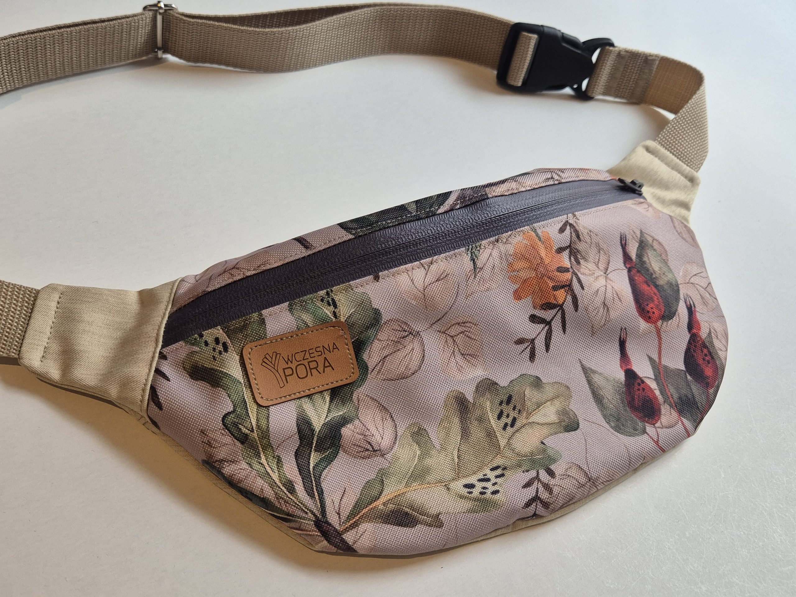Mała nerka uszyta tkanin wodoodpornych, poliestrowych: piaskowego jeansu i beżowej tkaniny z roślinnym printem
