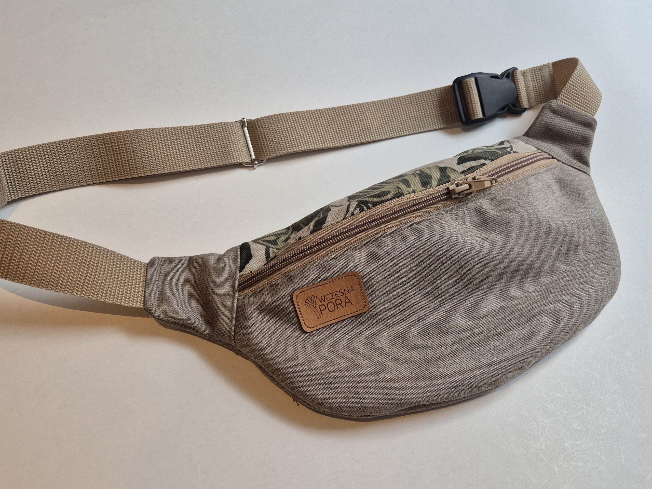 Mała nerka uszyta z beżowej tkaniny obiciowej i beżowych spodni bawełnianych w monstery.