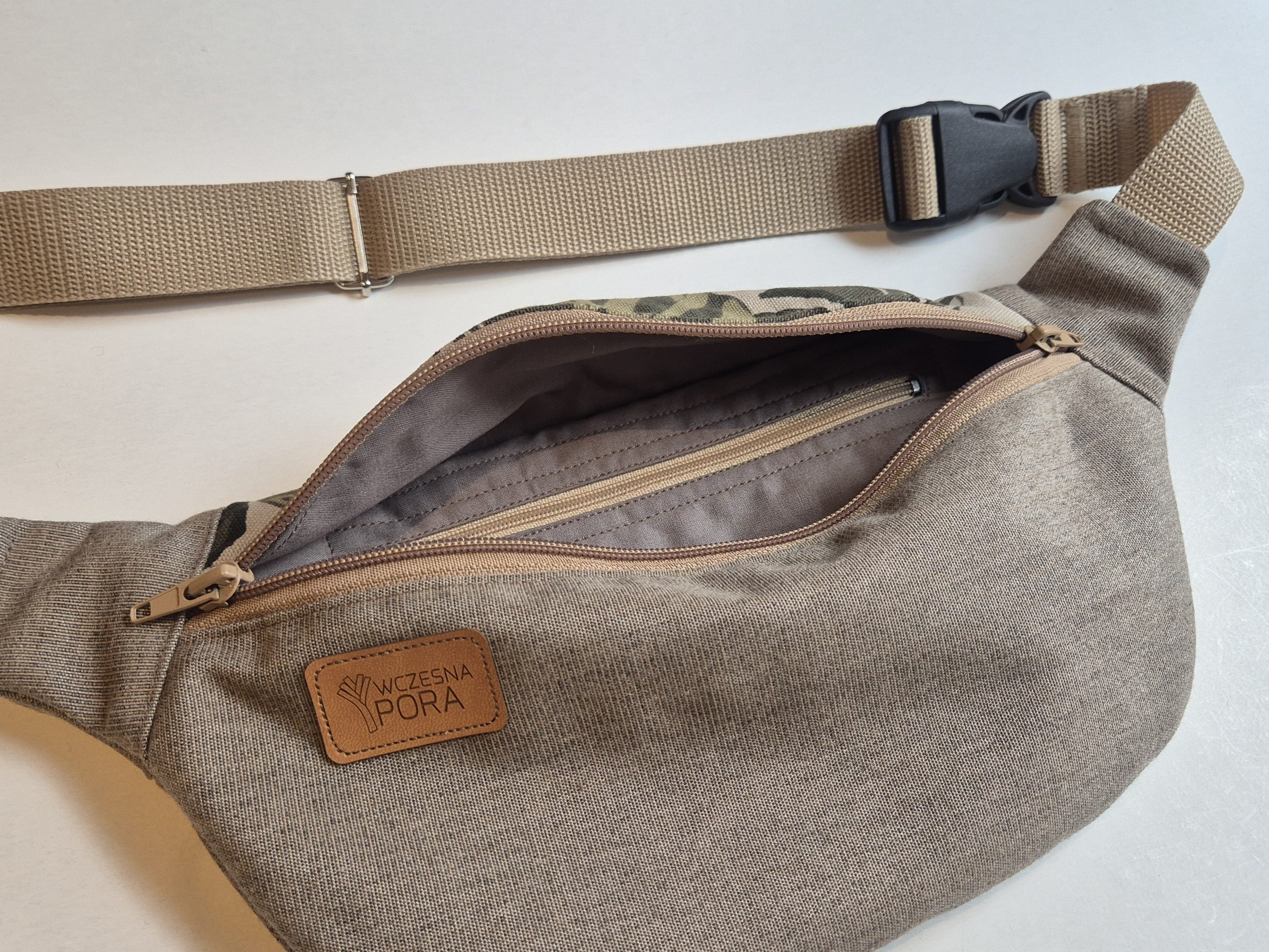 Długi, regulowany pasek w kolorze beżowym zapinany na klamrę, dzięki któremu łatwo dopasować nerkę do swojego rozmiaru.