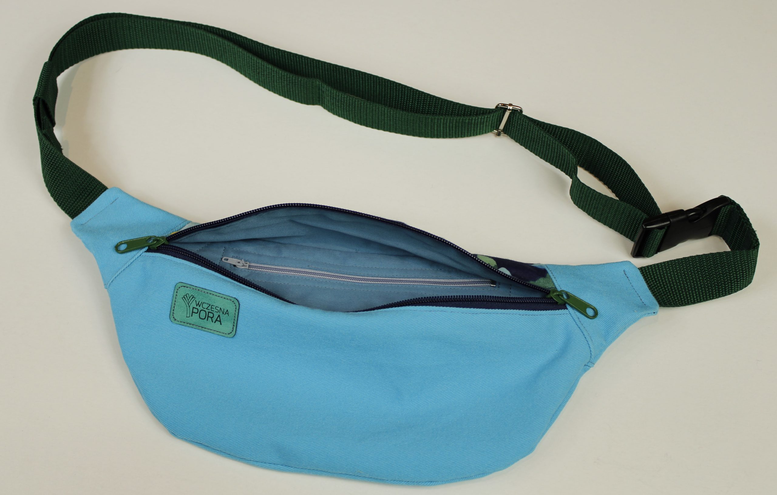 W środku błękitna podszewka i dodatkowa kieszonka zamykana na suwak.