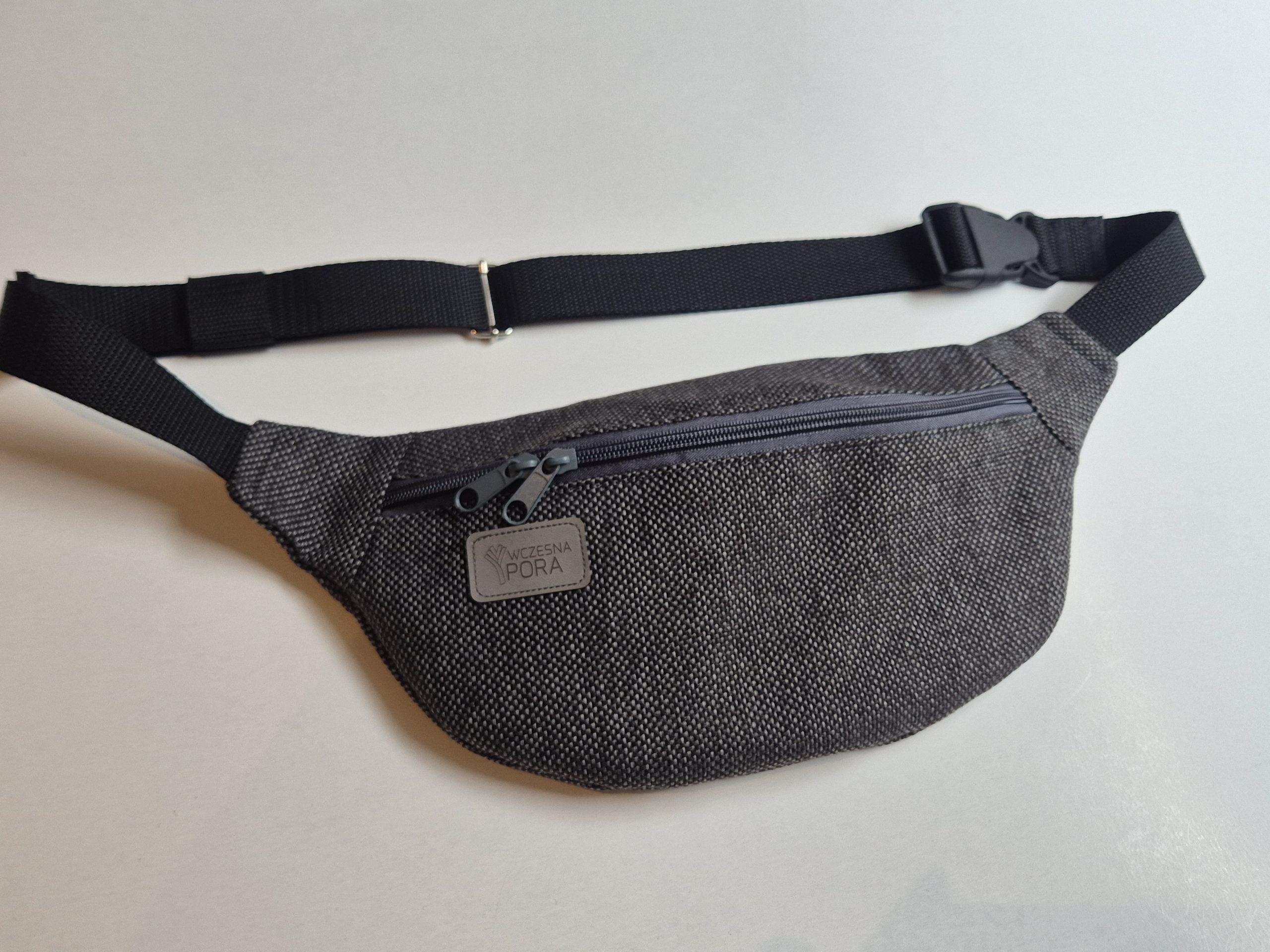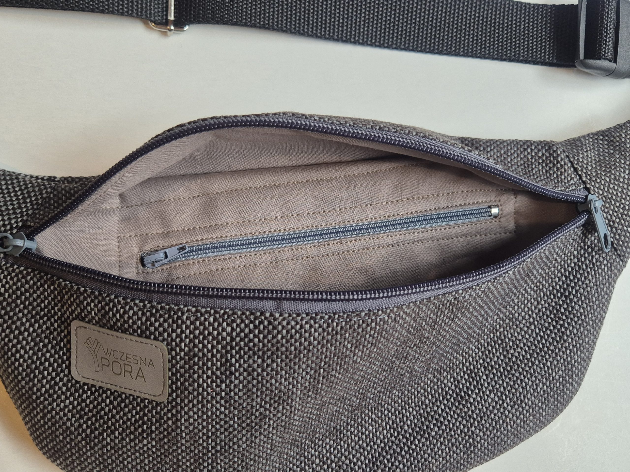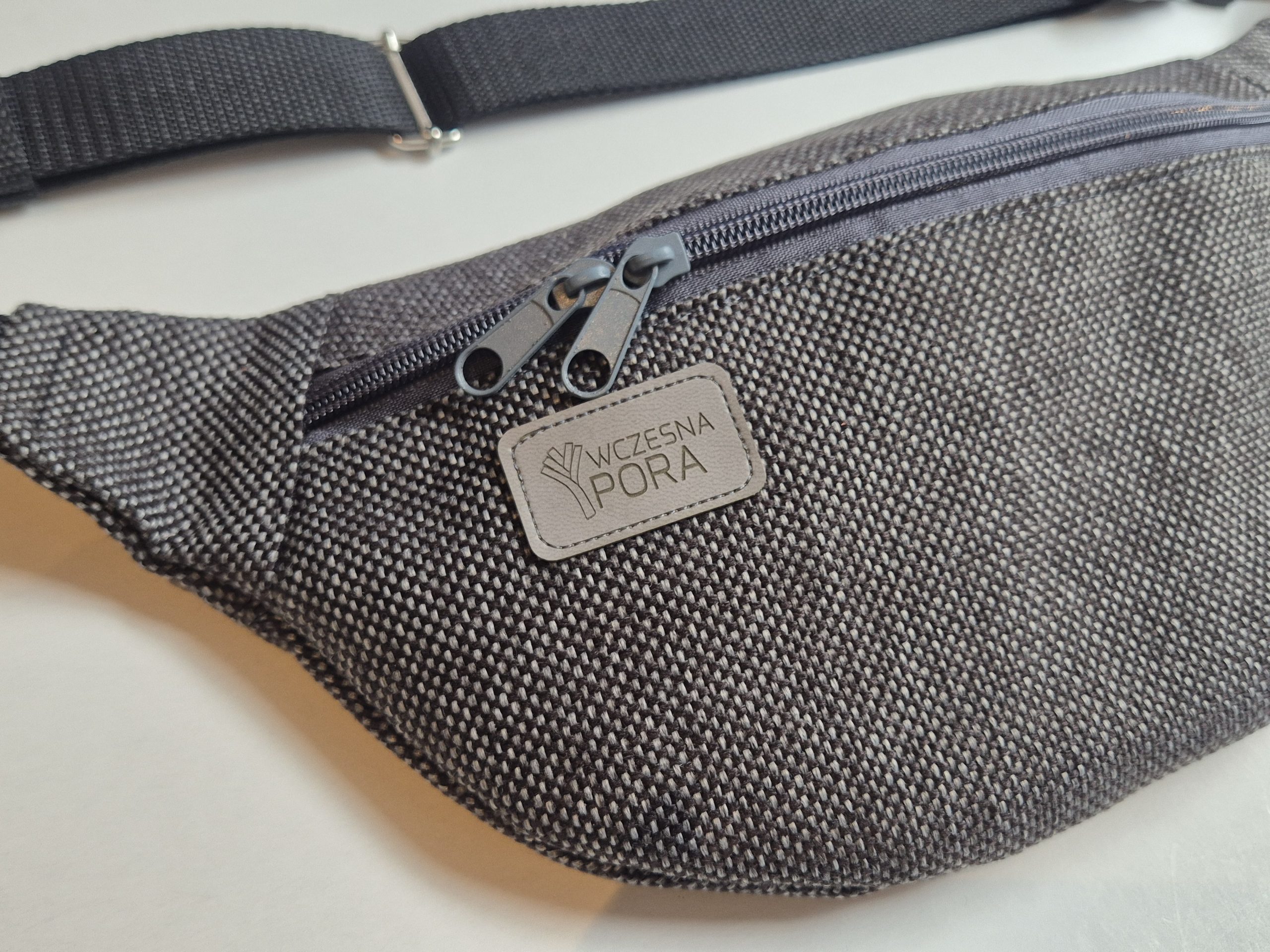 Mała nerka uszyta z szaro-czarnej plecionki tapicerskiej