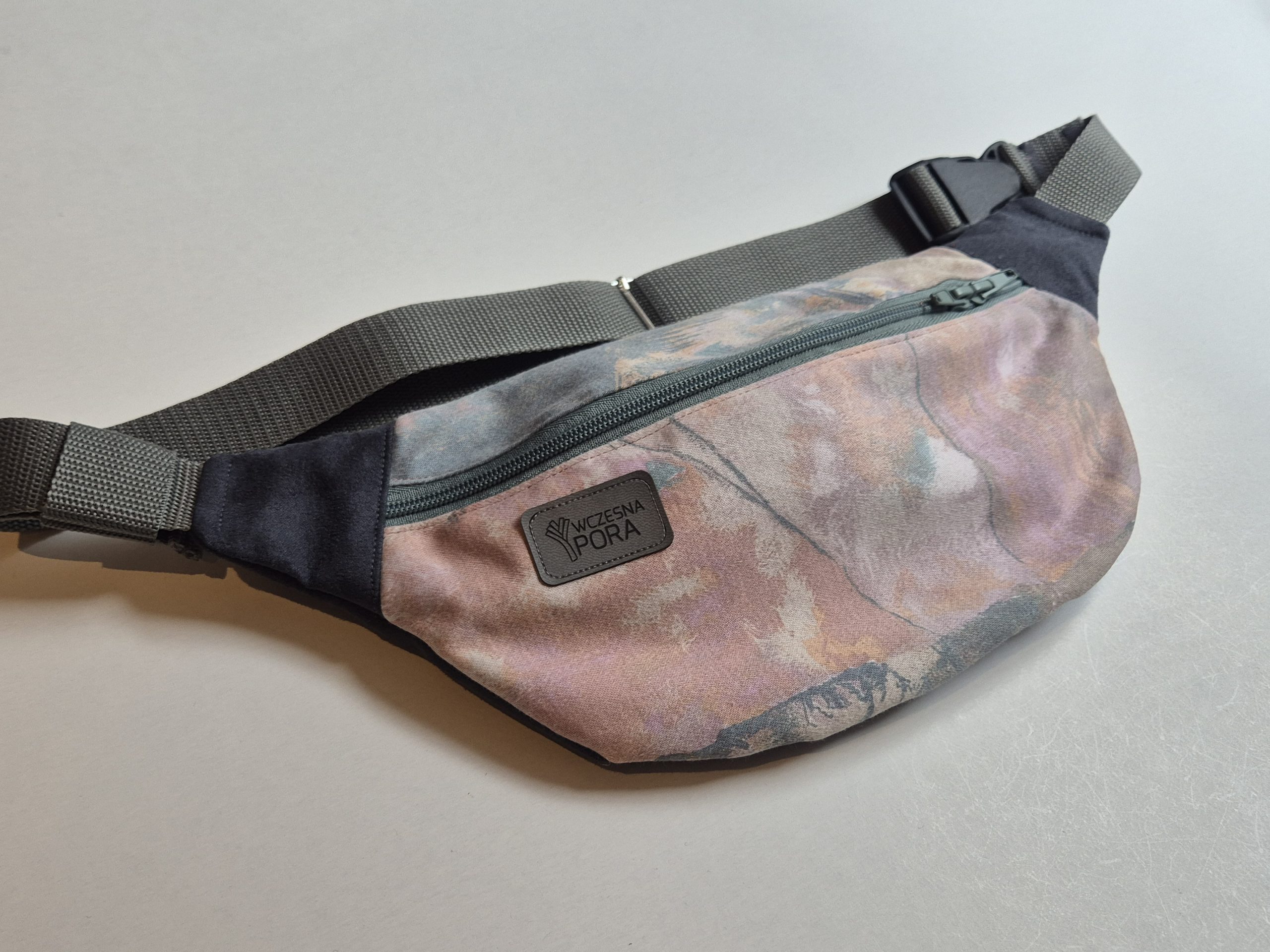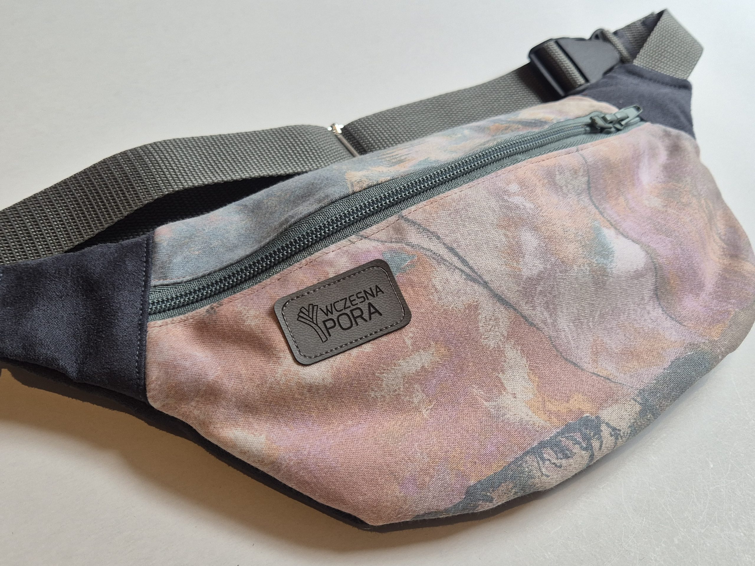 Mała nerka uszyta z szarej tkaniny obiciowej i zasłony w różowo-błękitny melanż