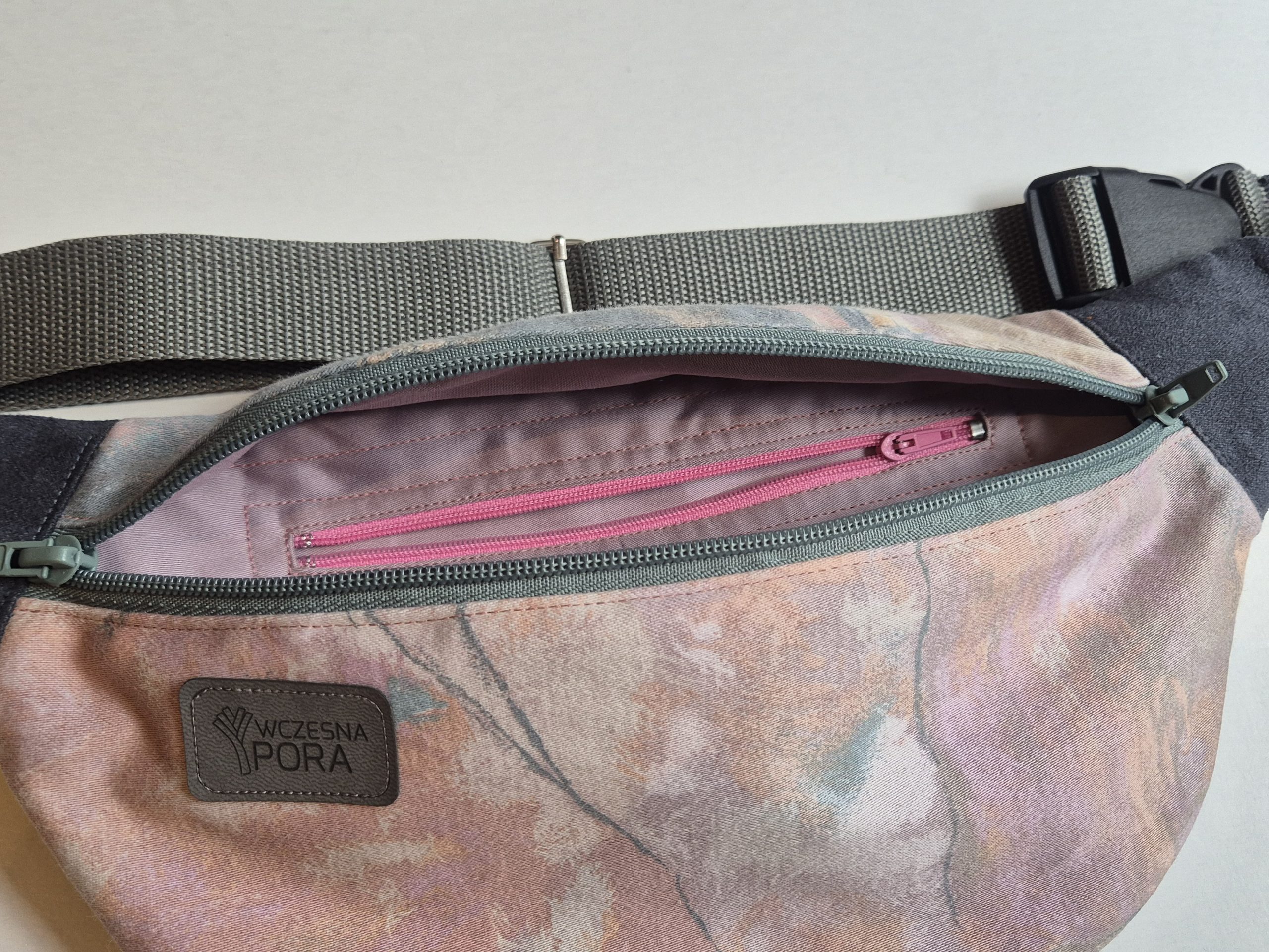 W środku różowa podszewka + dodatkowa kieszonka zamykana na suwak.