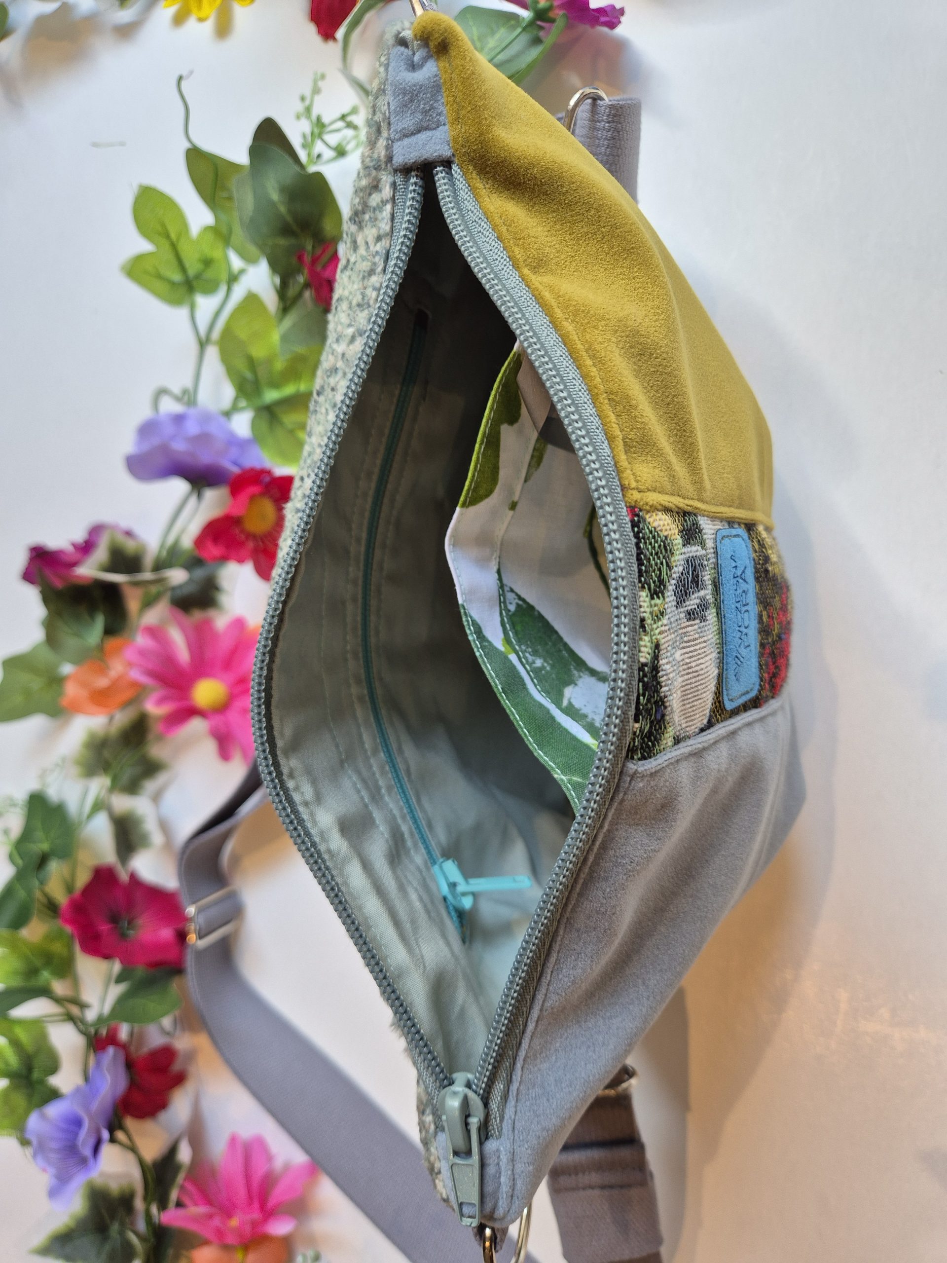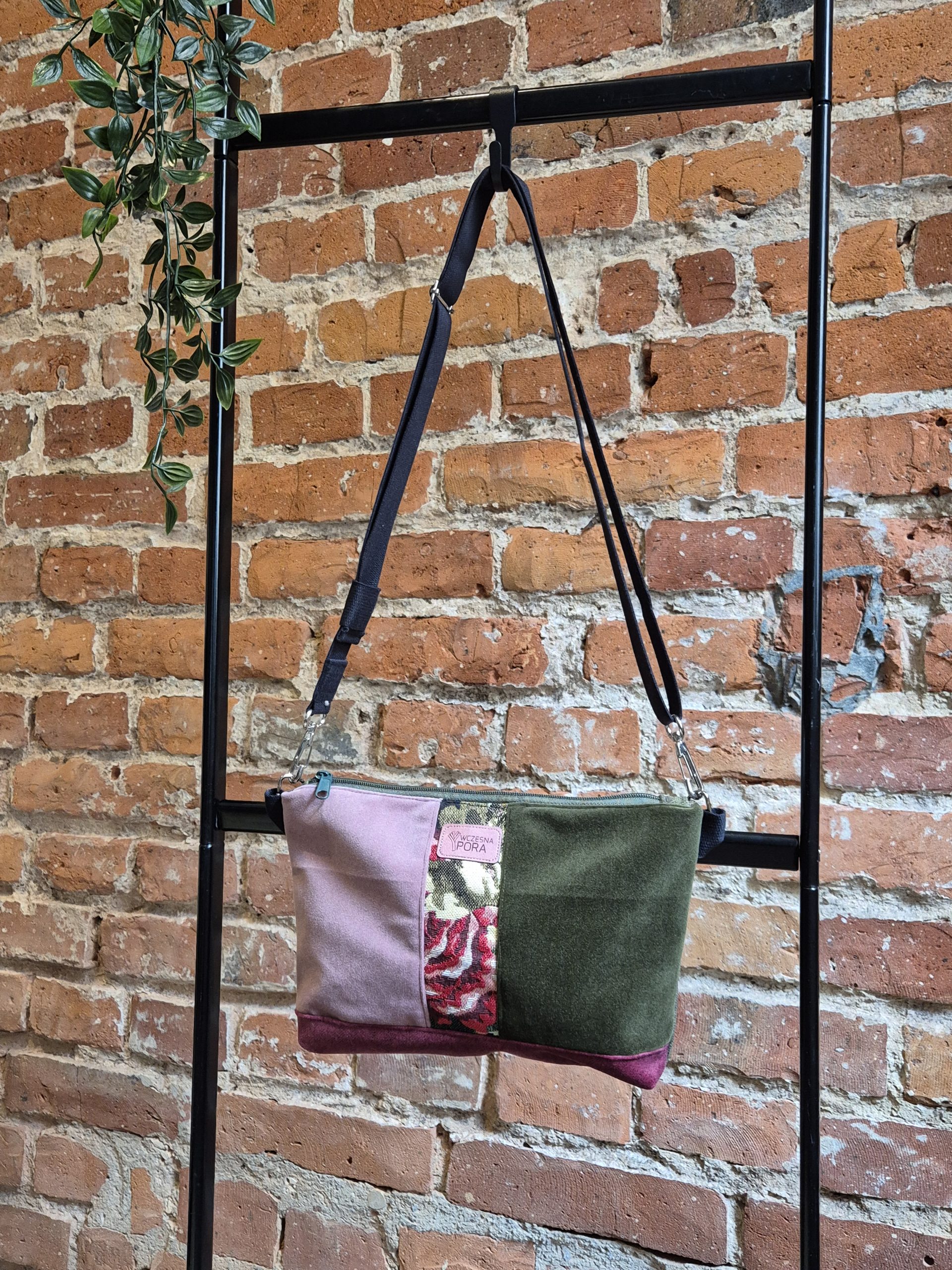 Mała torebka uszyta z weluru i żakardu tapicerskiego – z przodu piękne połączenie bł,ękitu, zieleni oraz żakardu z roślinnym motywem, tył cały w marmurkowej zieleni.