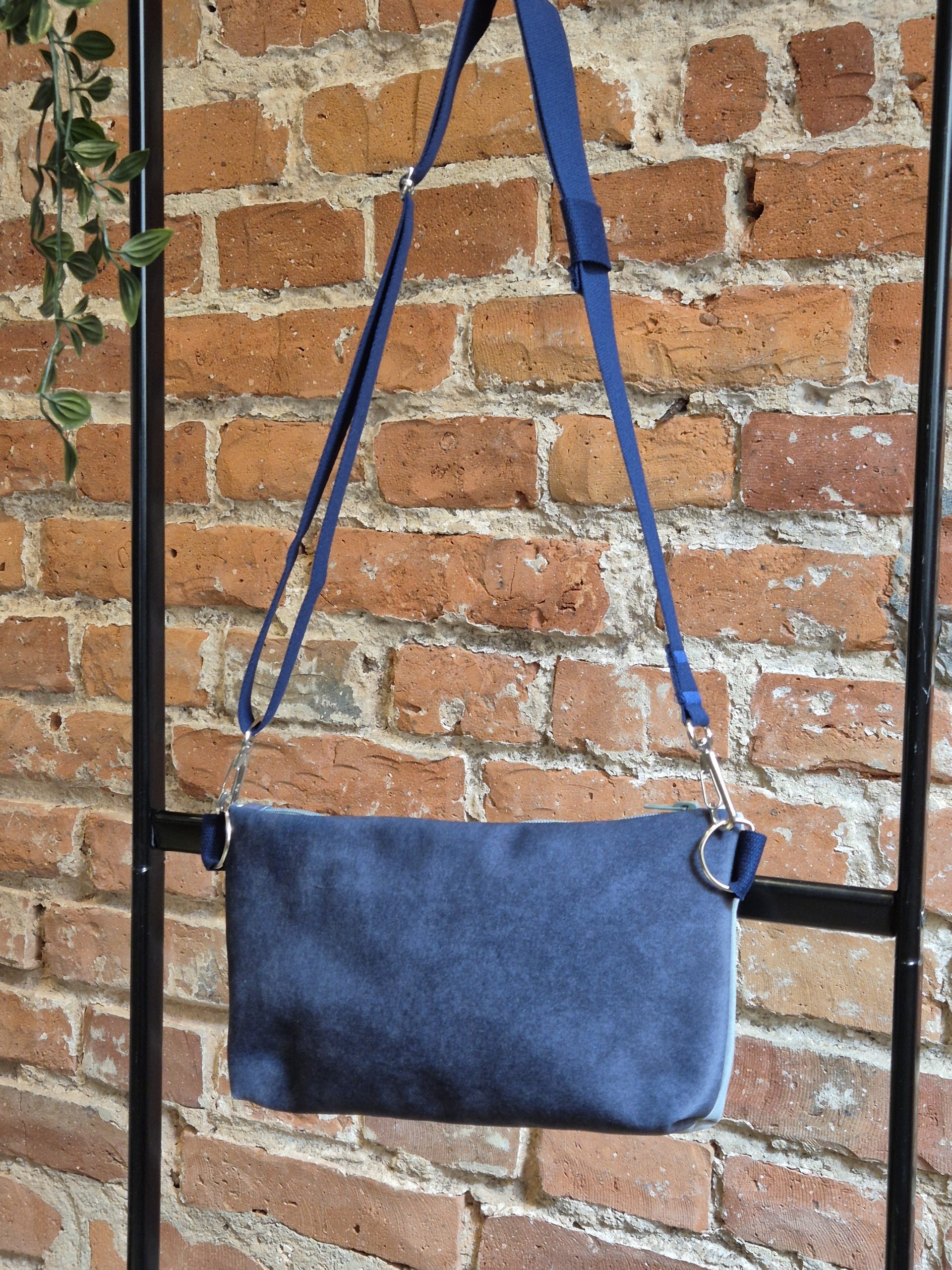Długi, regulowany, wymienny pasek bawełniany w kolorze granatowym.