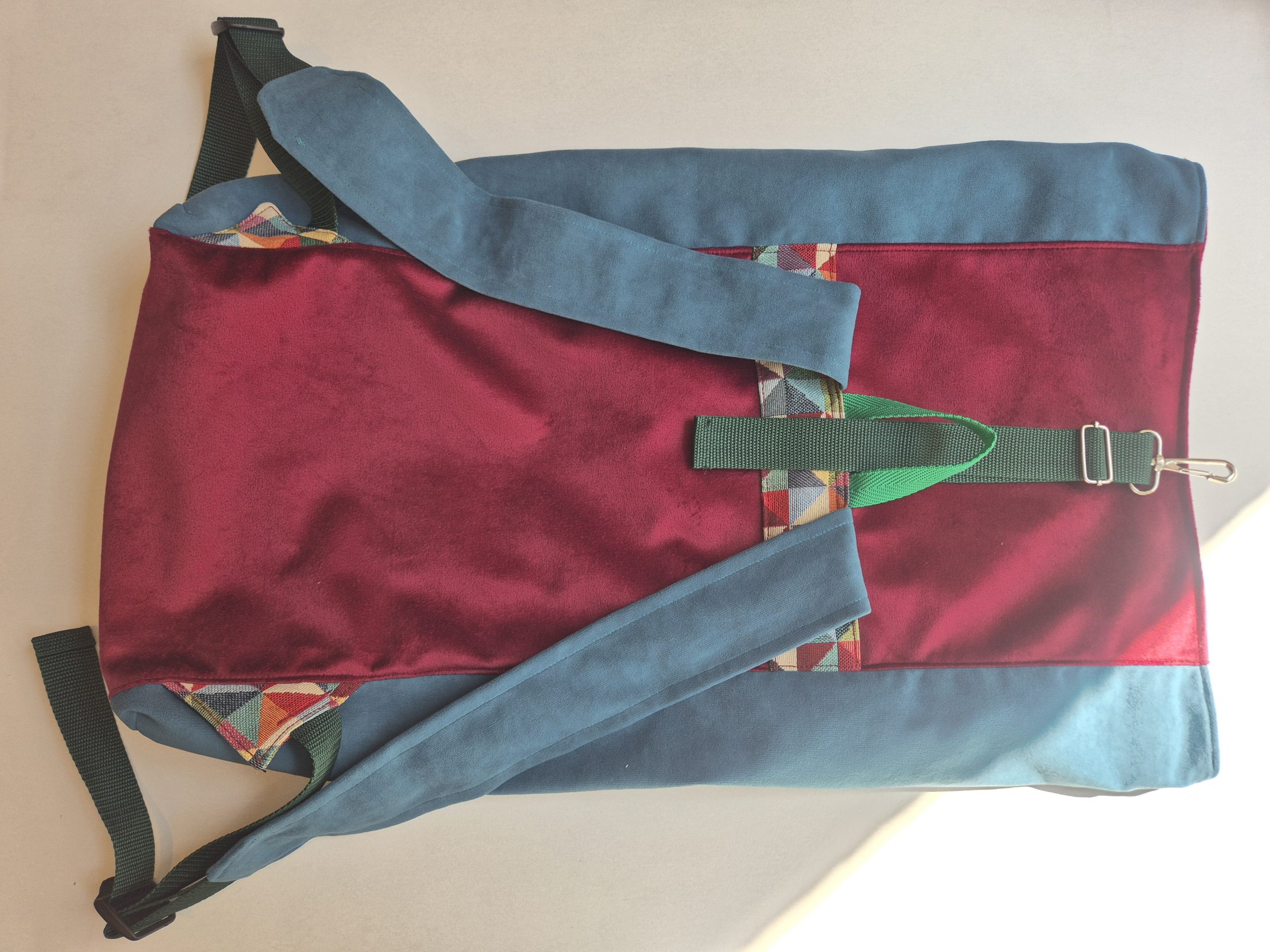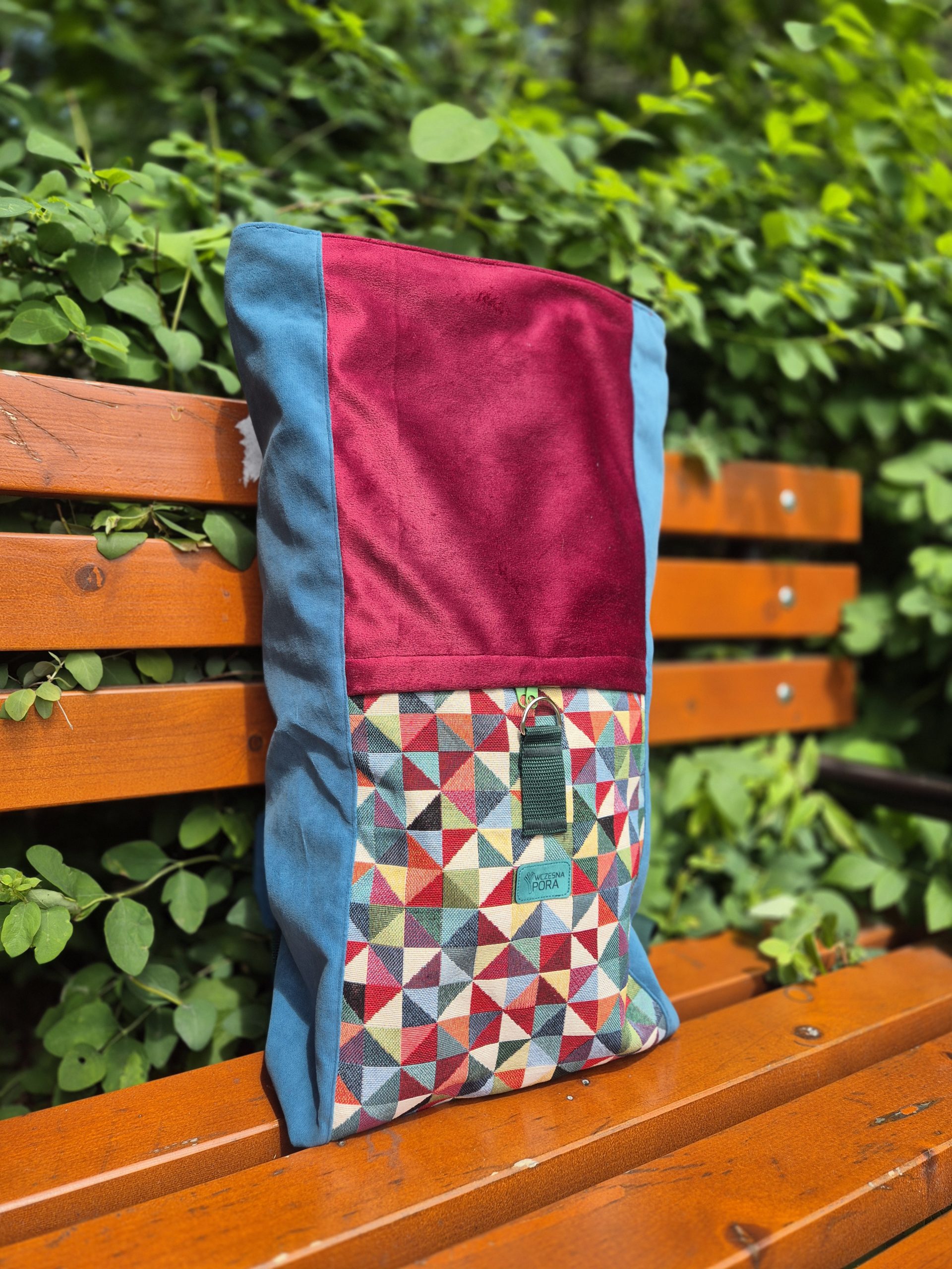 Duży plecak kurierski uszyty z welurów obiciowych w kolorach – turkusowym i bordowym oraz żakardu w kolorowe trójkąty