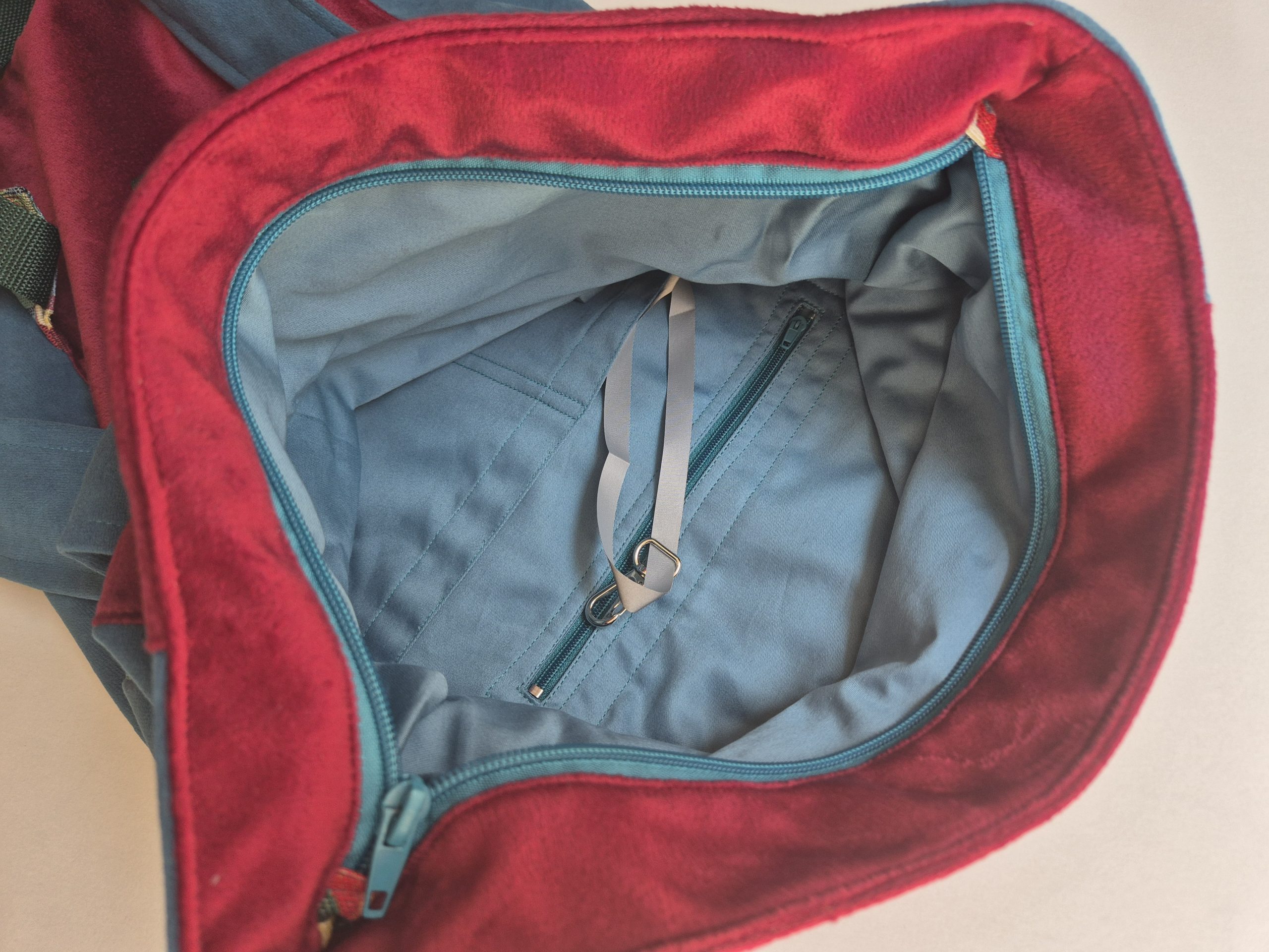 W środku turkusowa podszewka z dodatkowymi kieszeniami – bezpieczną – zamykaną na suwak, oraz dwudzielną – z przypinką na klucze.