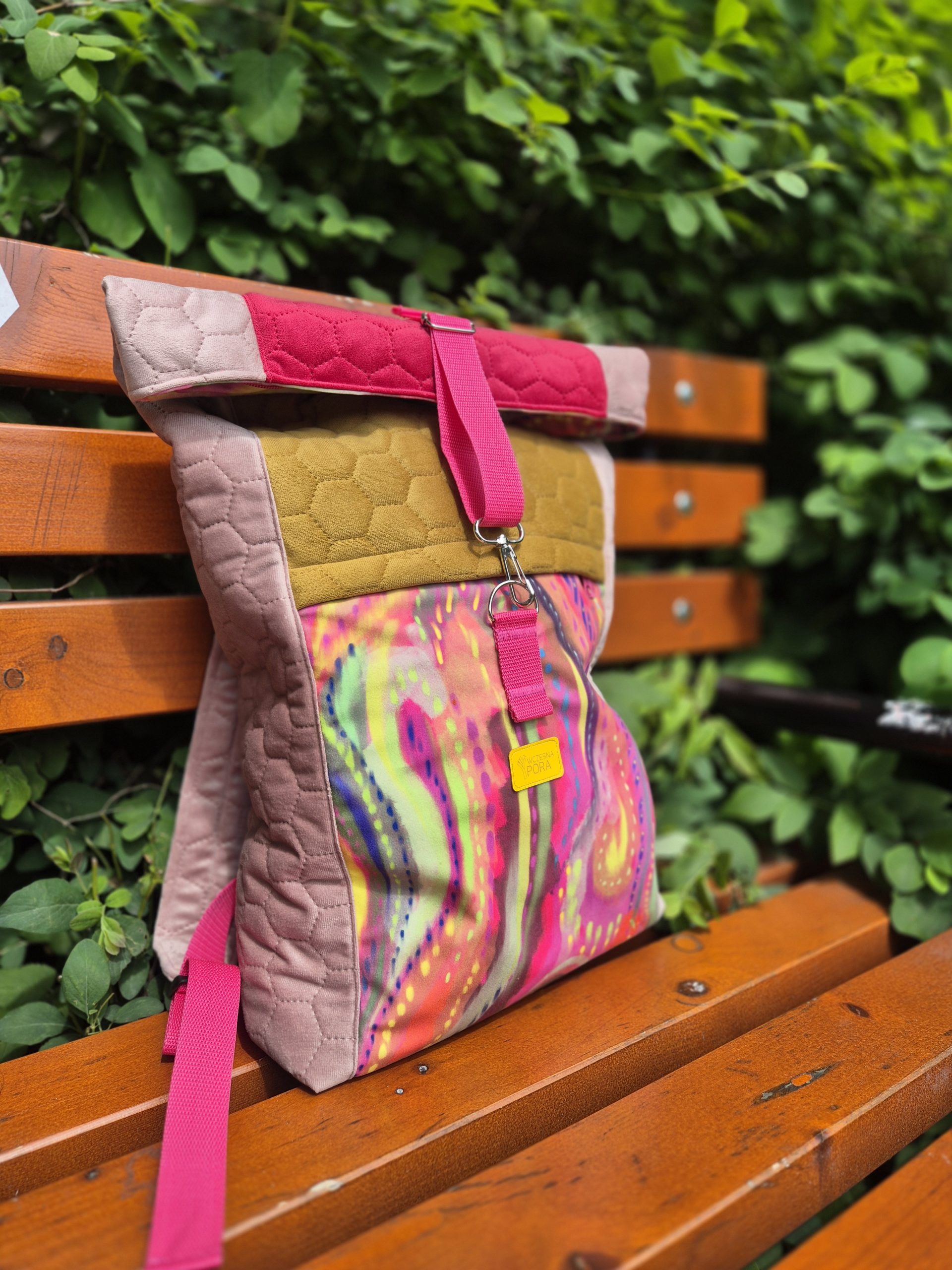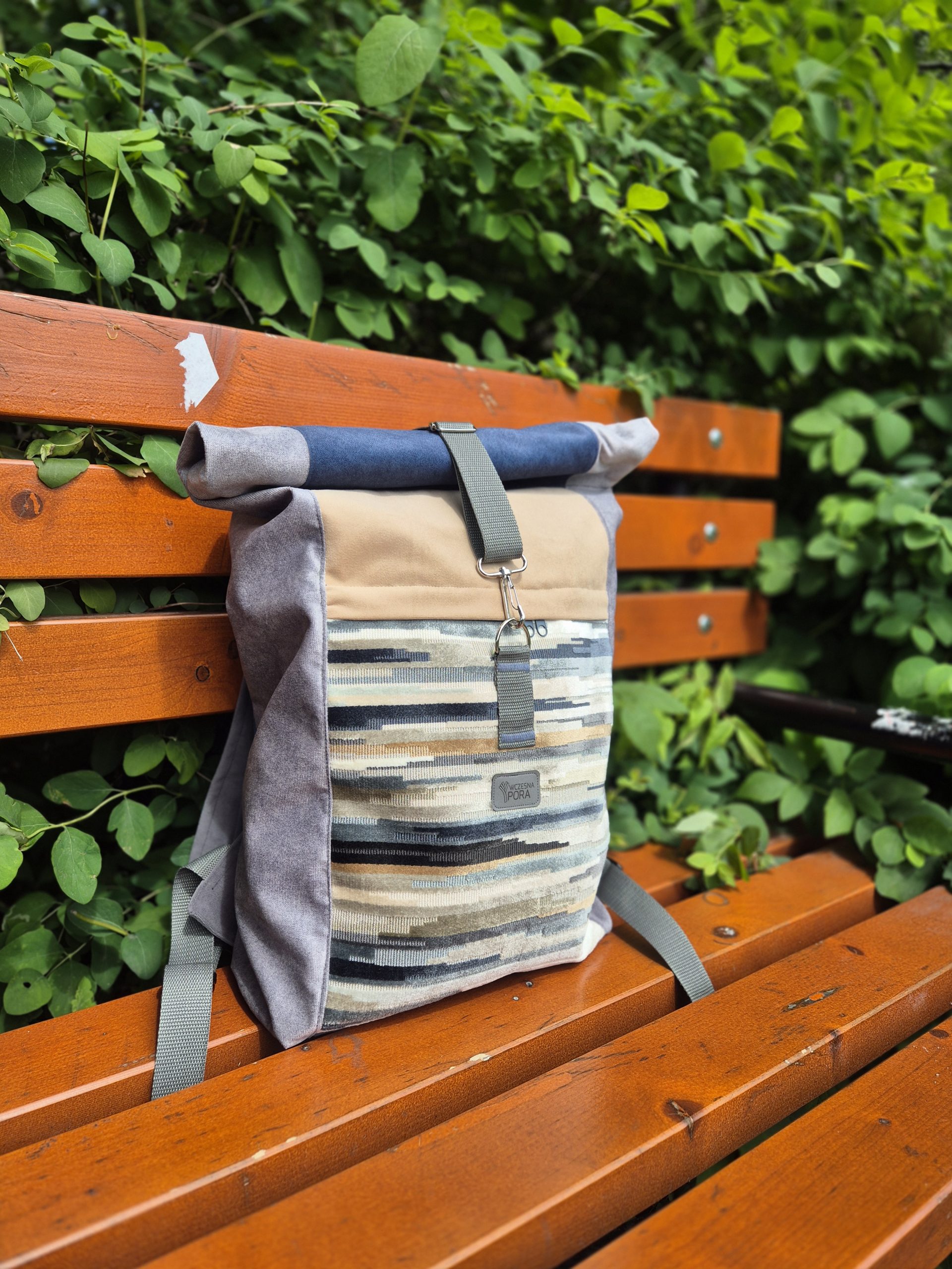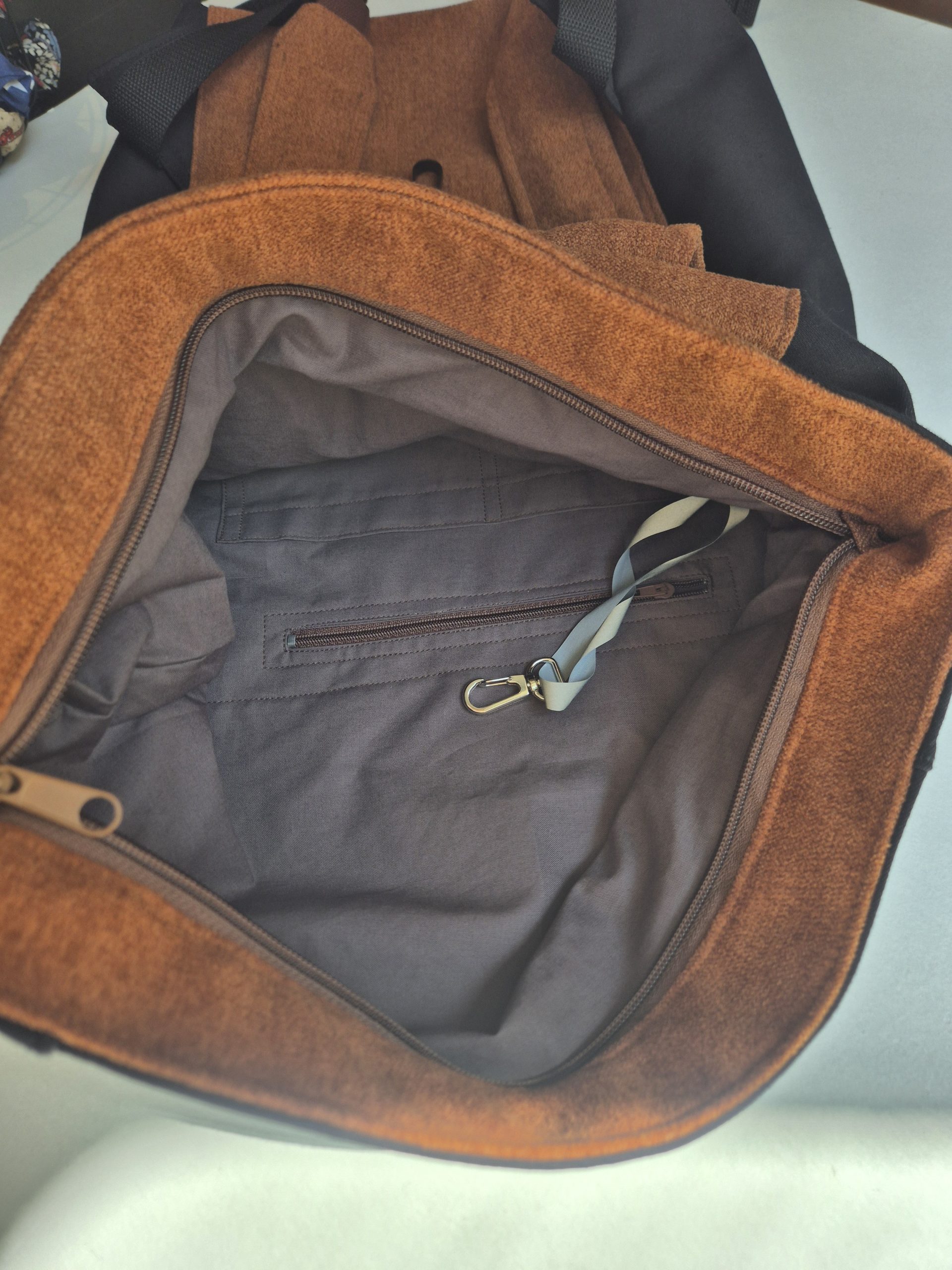 Duży plecak kurierski uszyty z czarnego jeansu, brązowej tkaniny obiciowej i czarnego żakardu z buddyjskim printem.