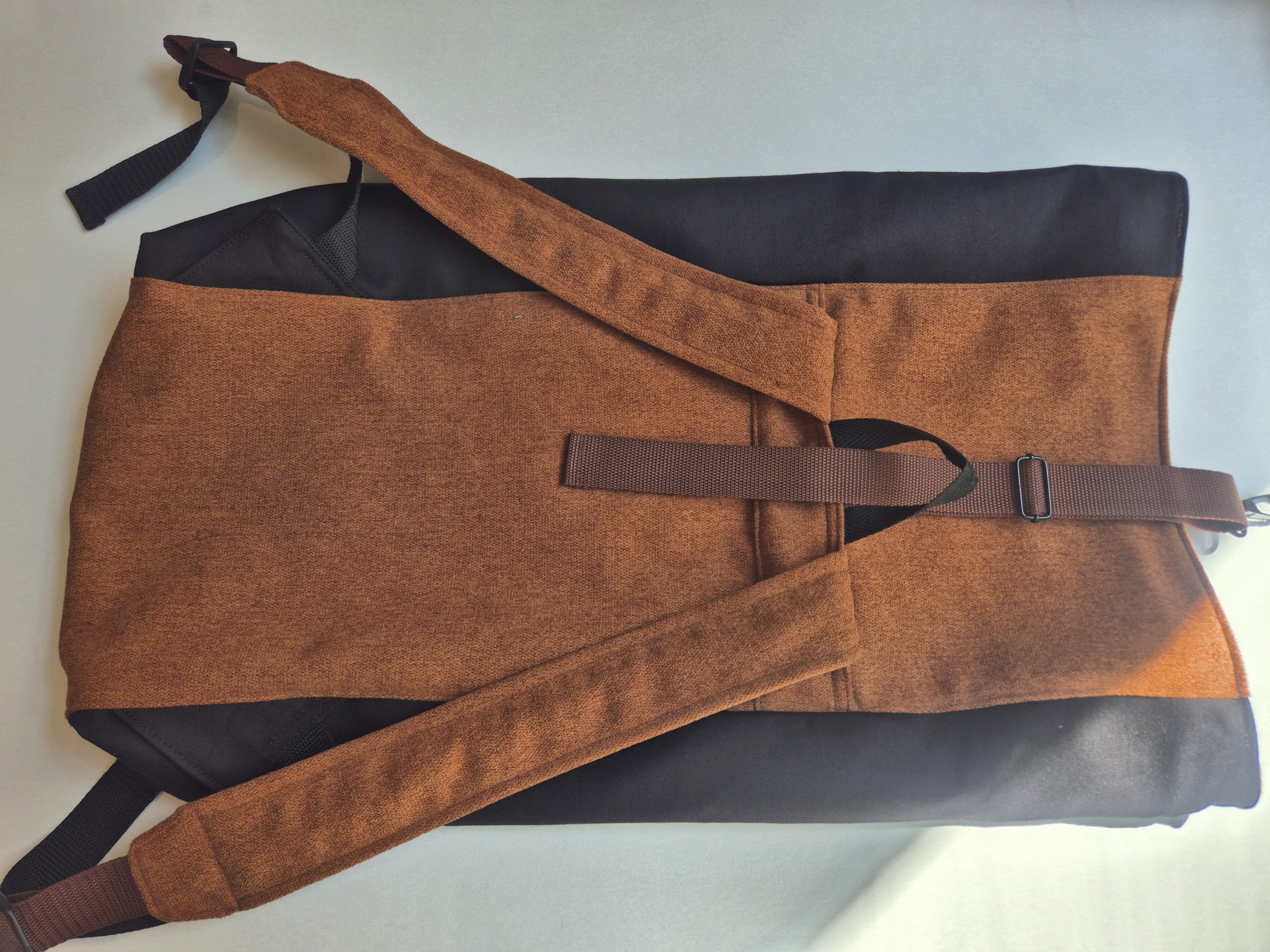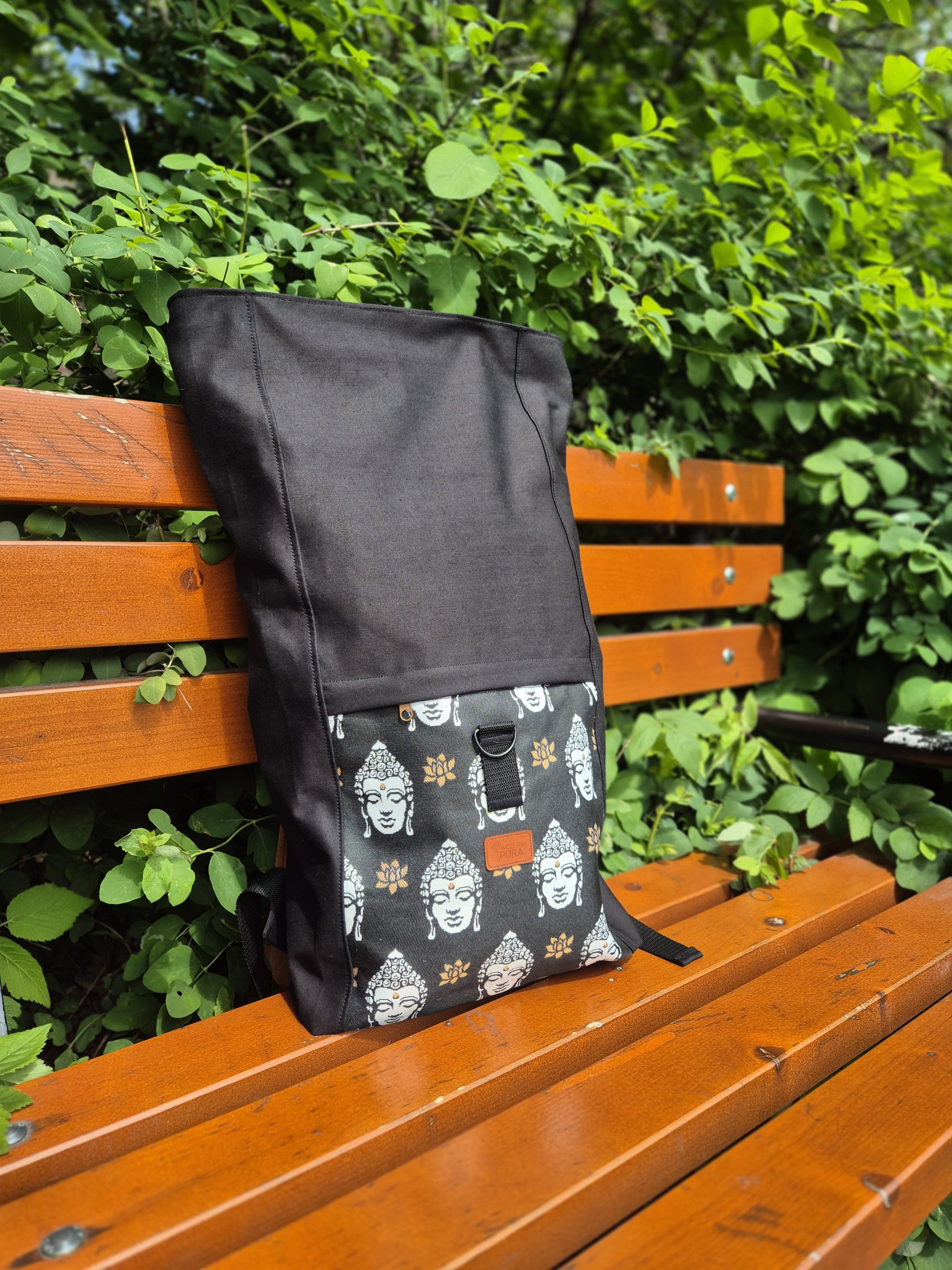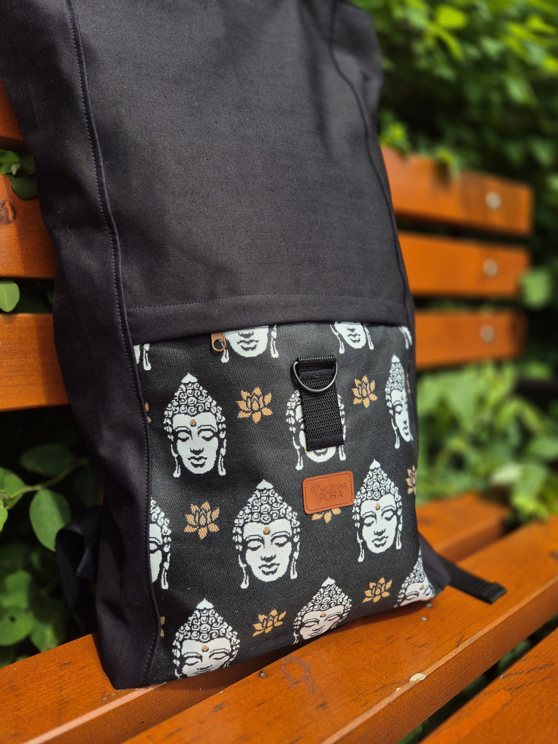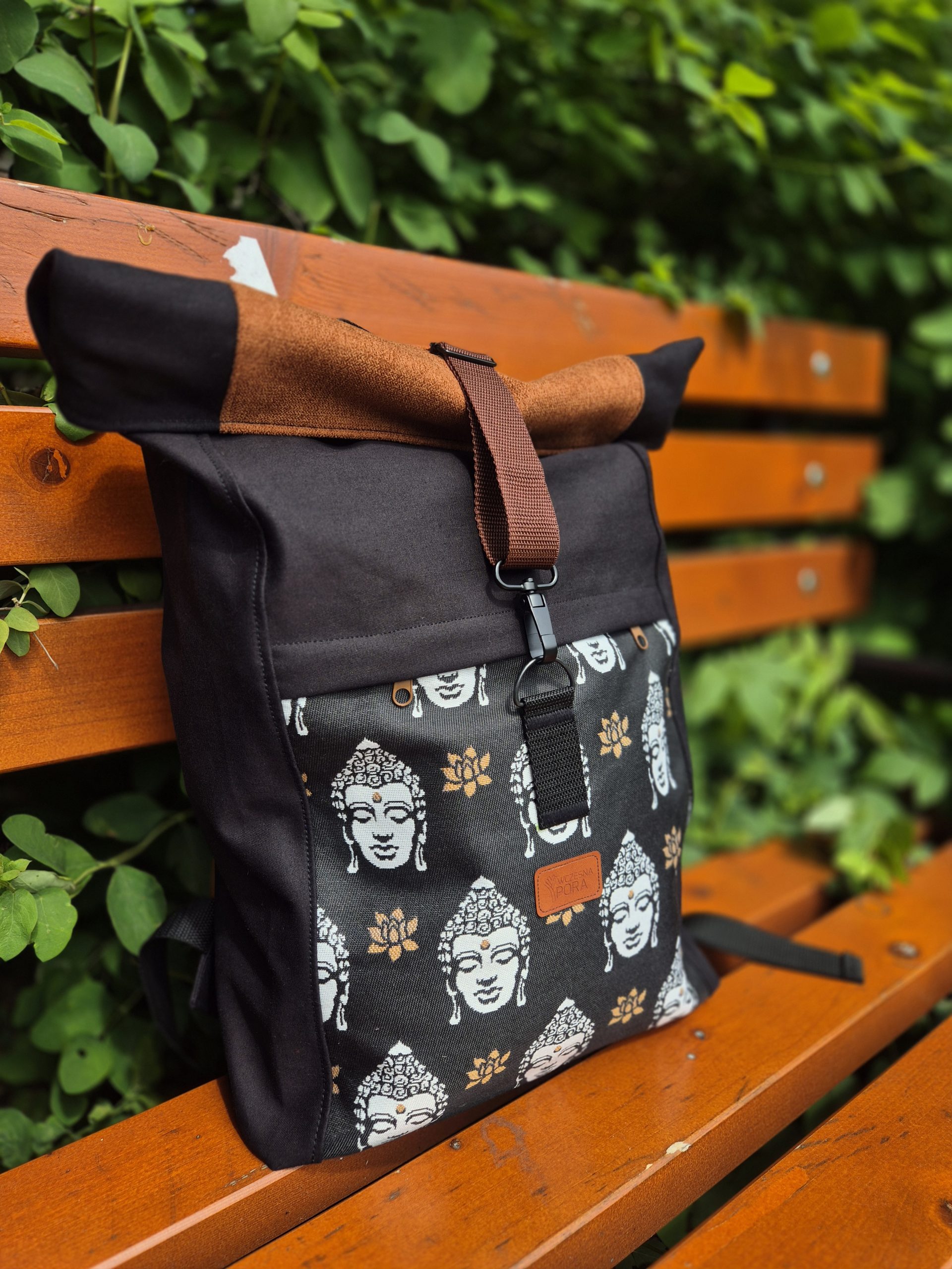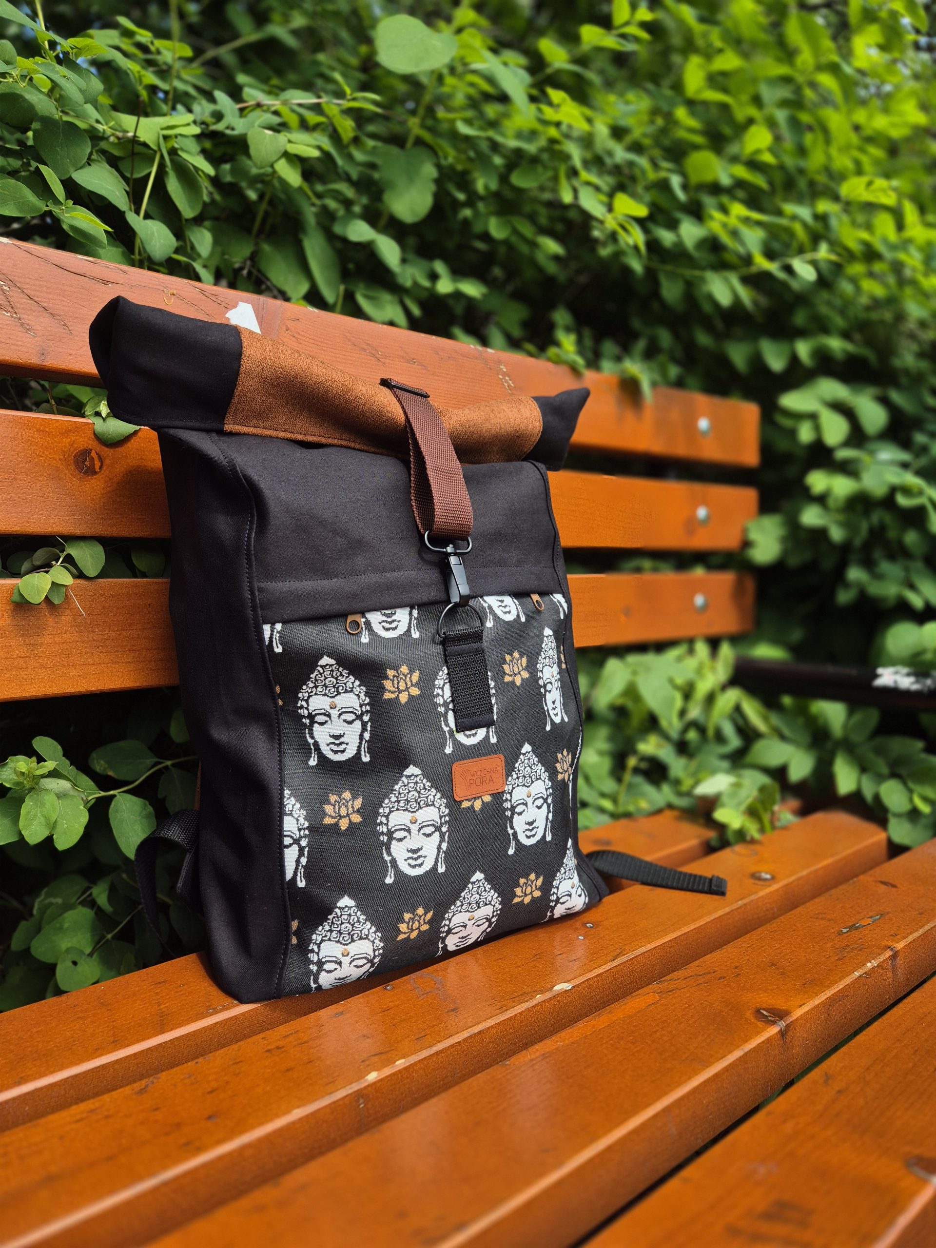 Czarno-brązowy plecak kurierski, z buddyjskim motywem i ukrytą kieszonką