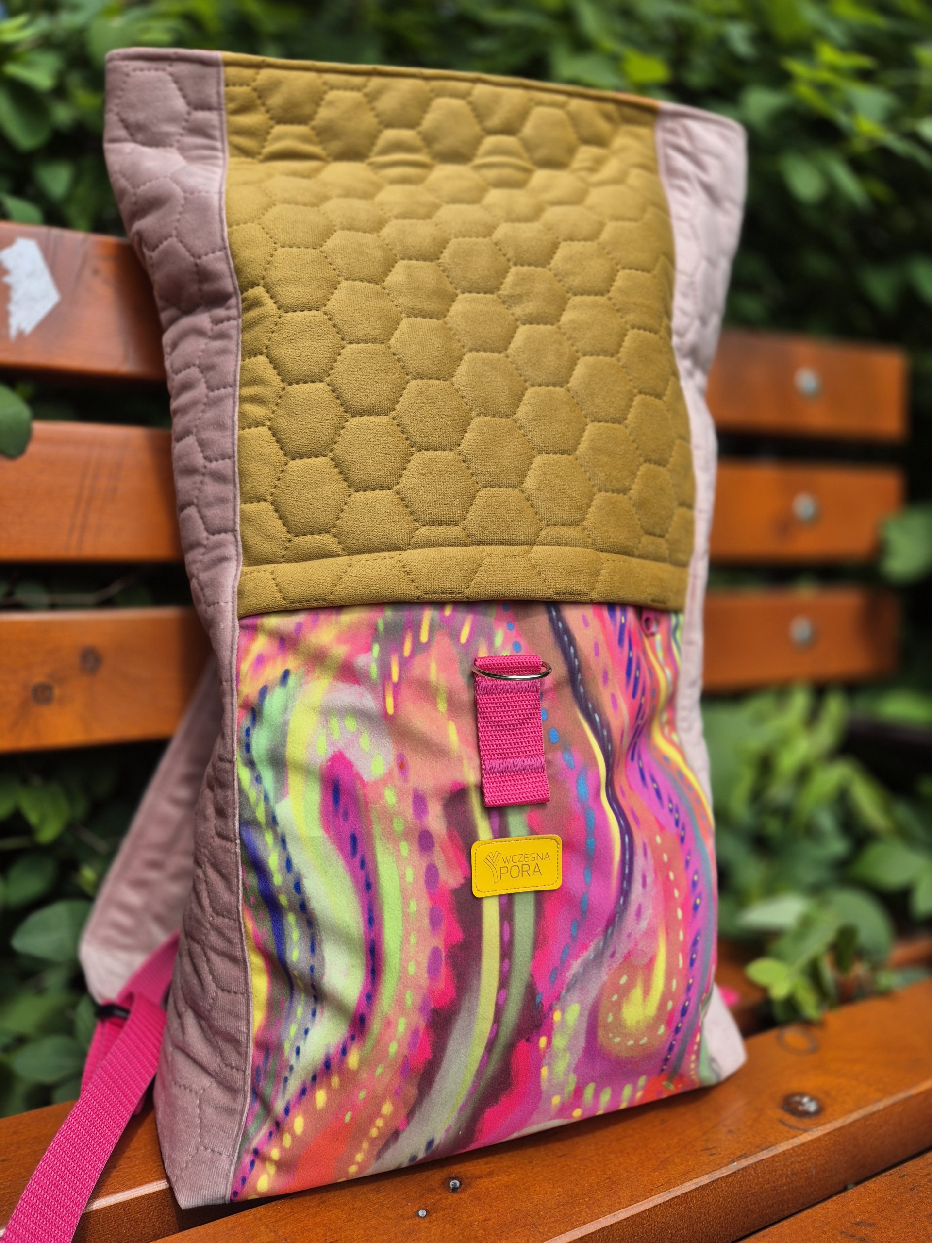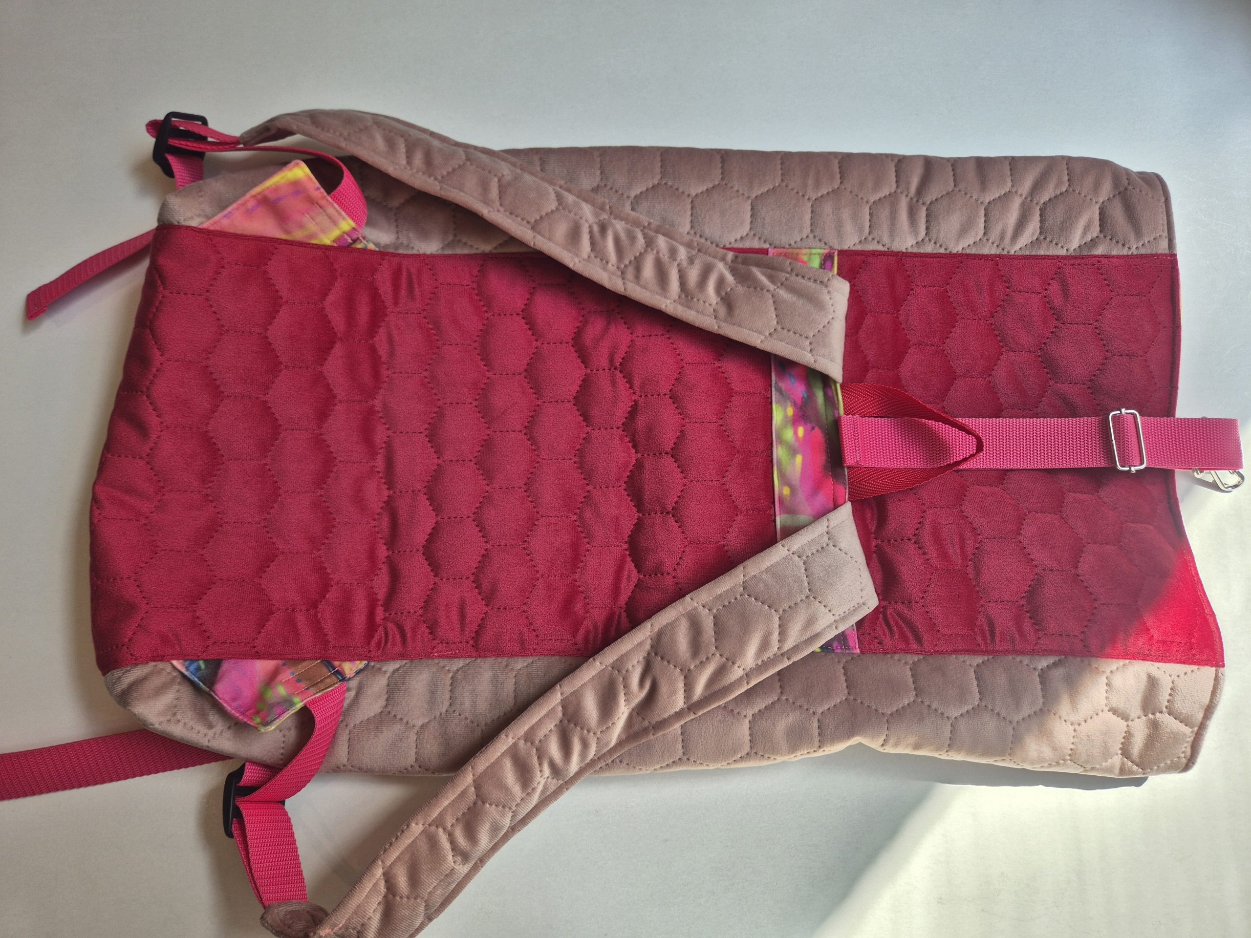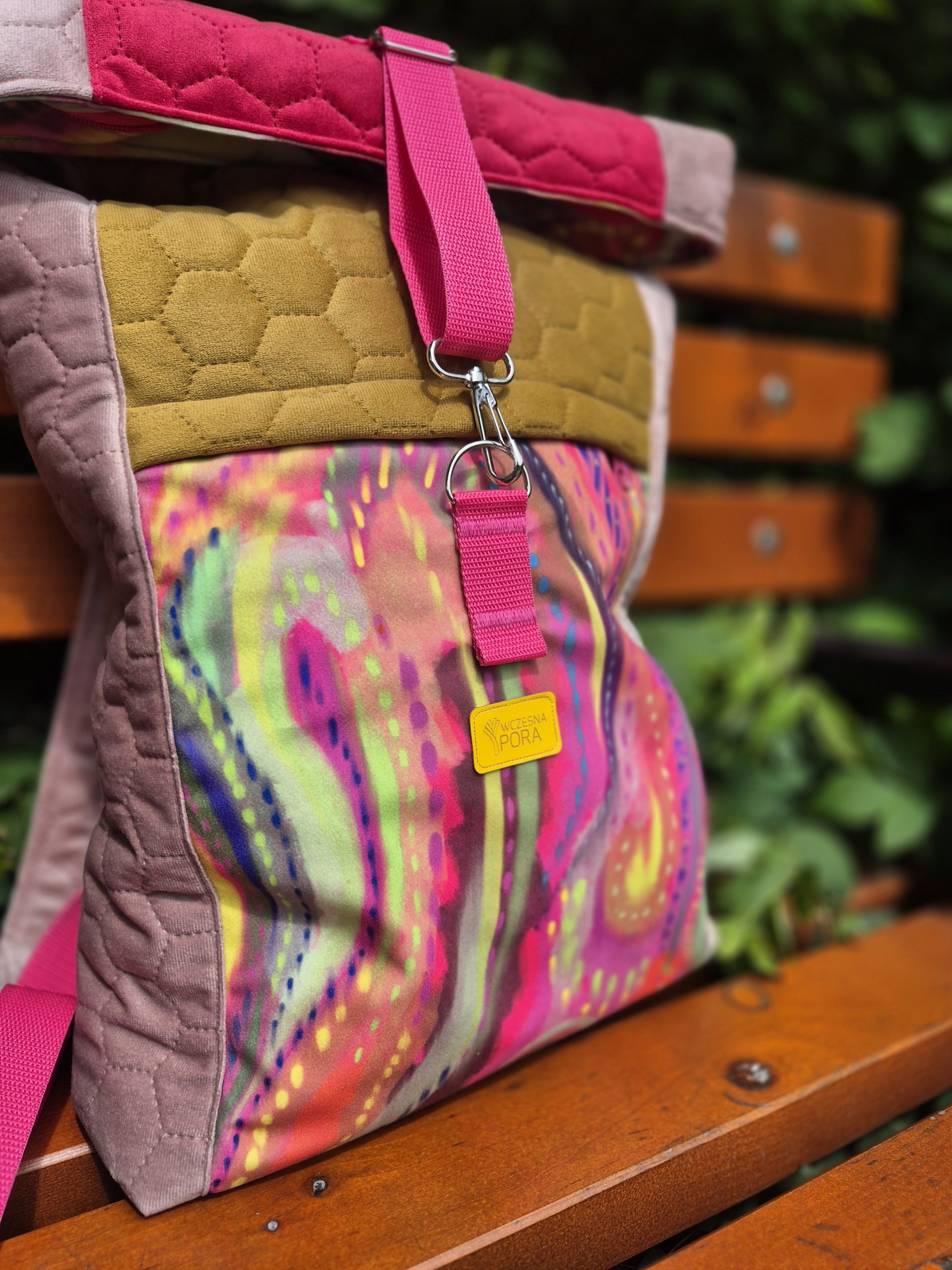 Duży plecak kurierski uszyty z welurów tapicerskich – różowego, czerwonego, miodowego i wielobarwnego