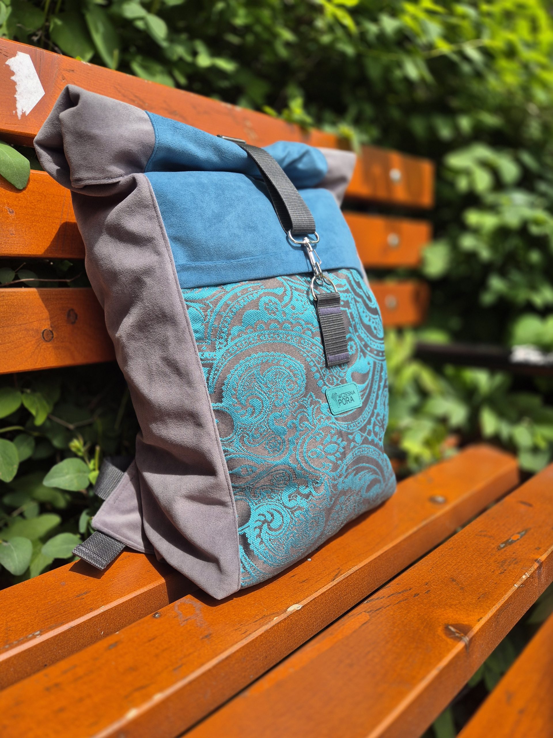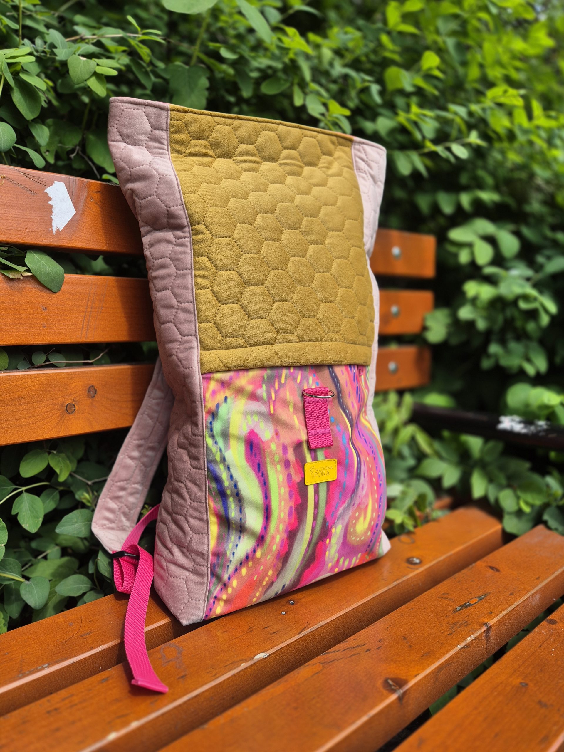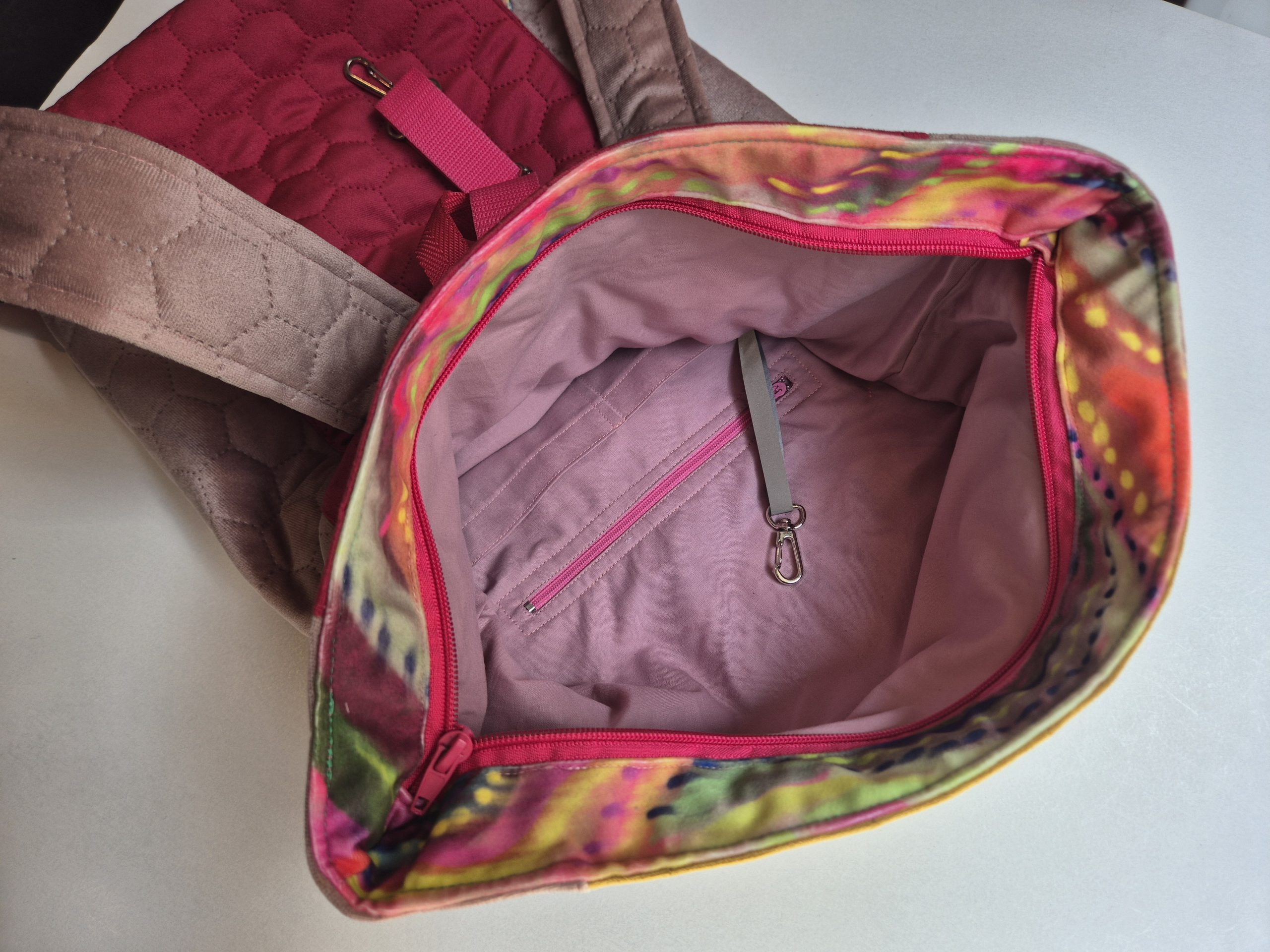 Duży plecak kurierski uszyty z welurów tapicerskich – różowego, czerwonego, miodowego i wielobarwnego