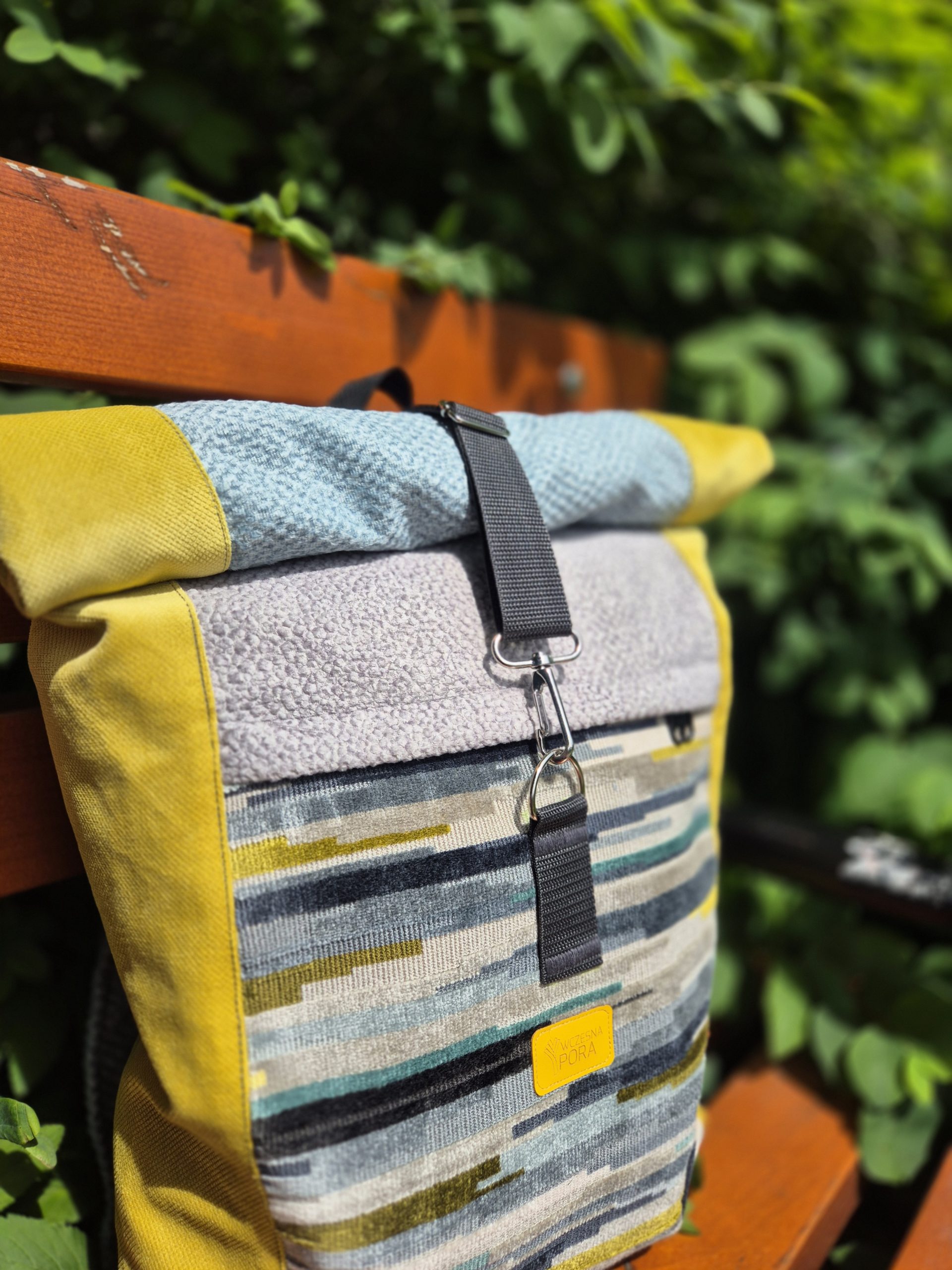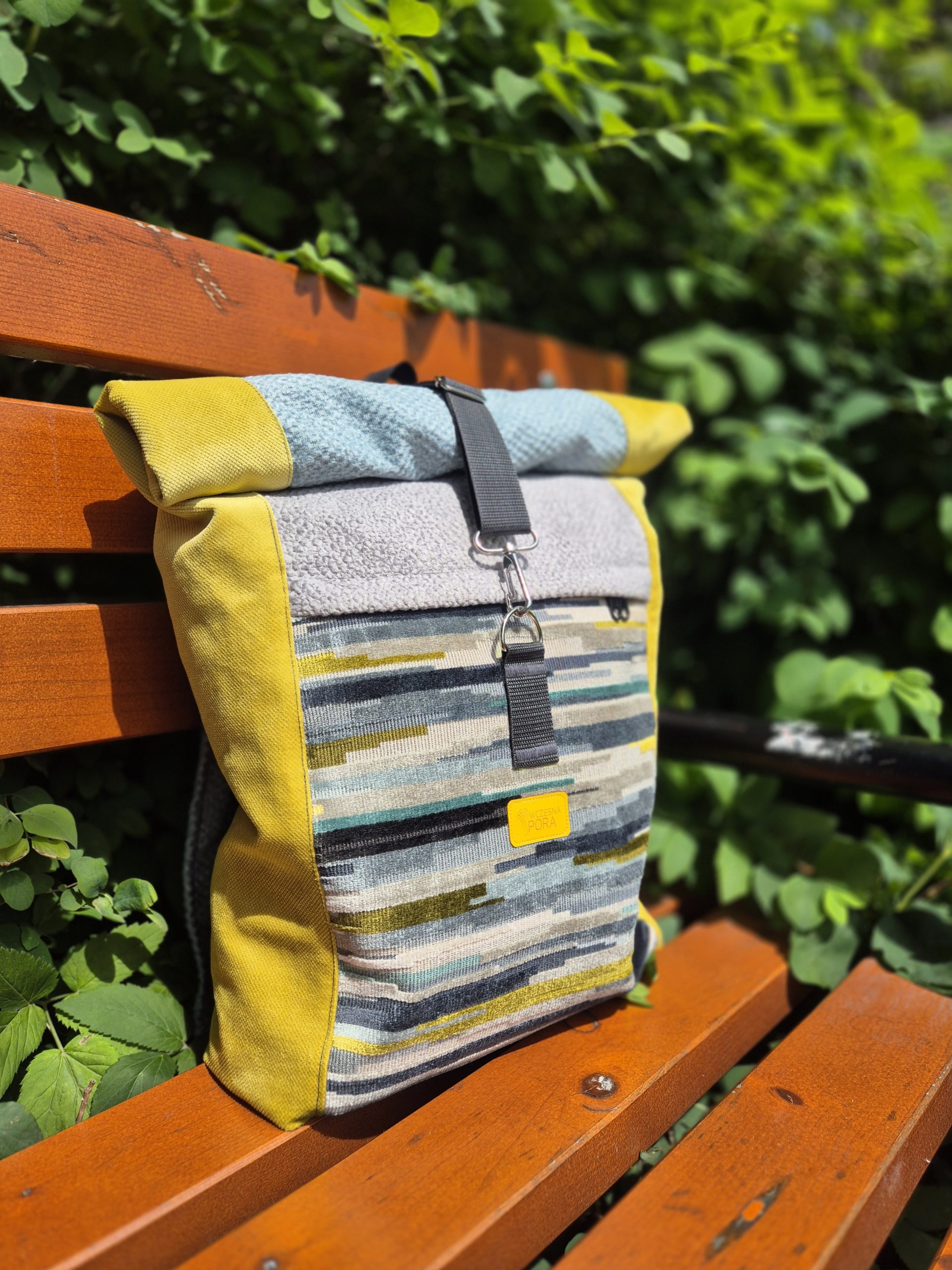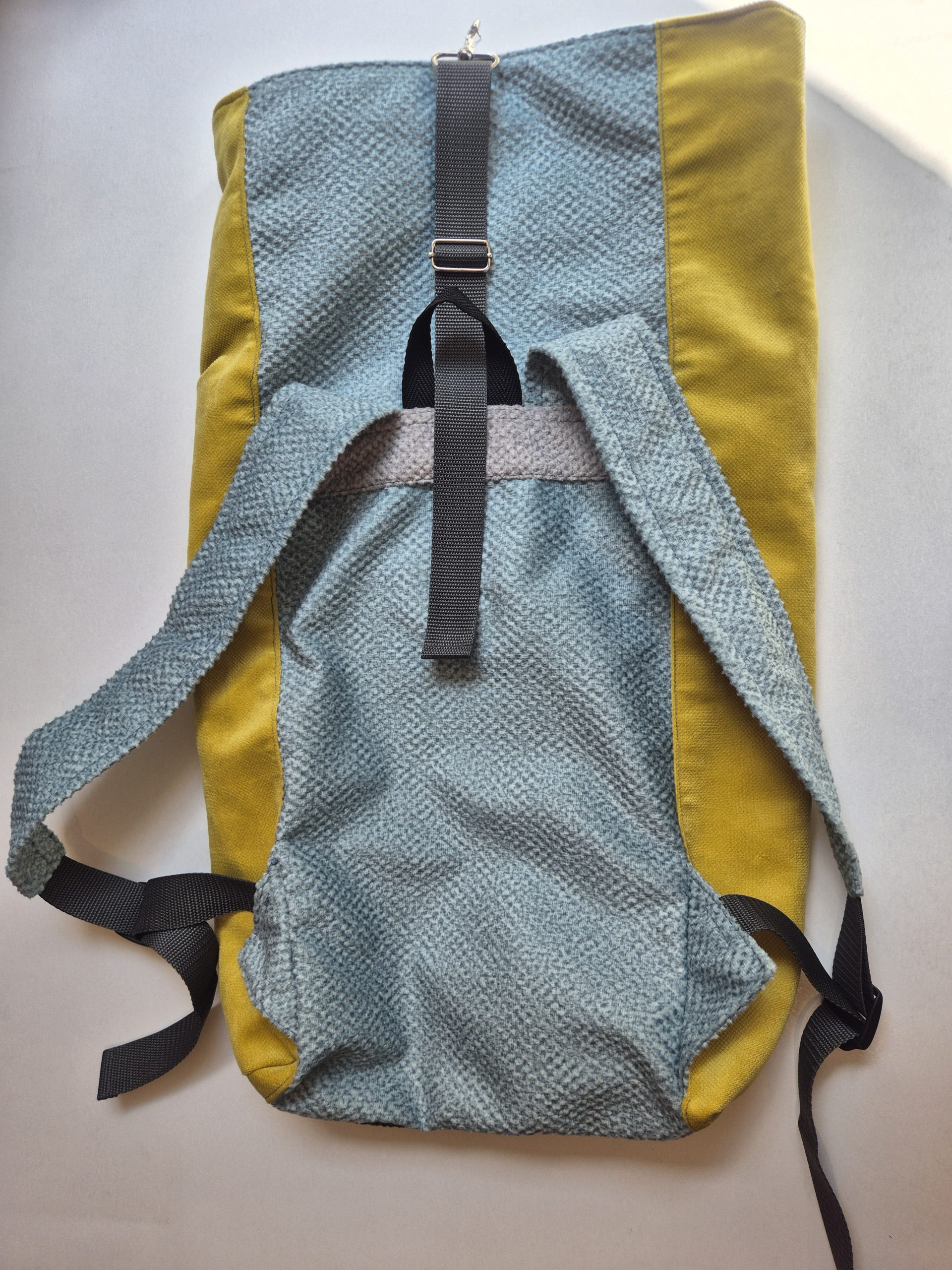 Duży plecak kurierski uszyty z welurów obiciowych w kolorach – miodowym, miętowym i szarym.