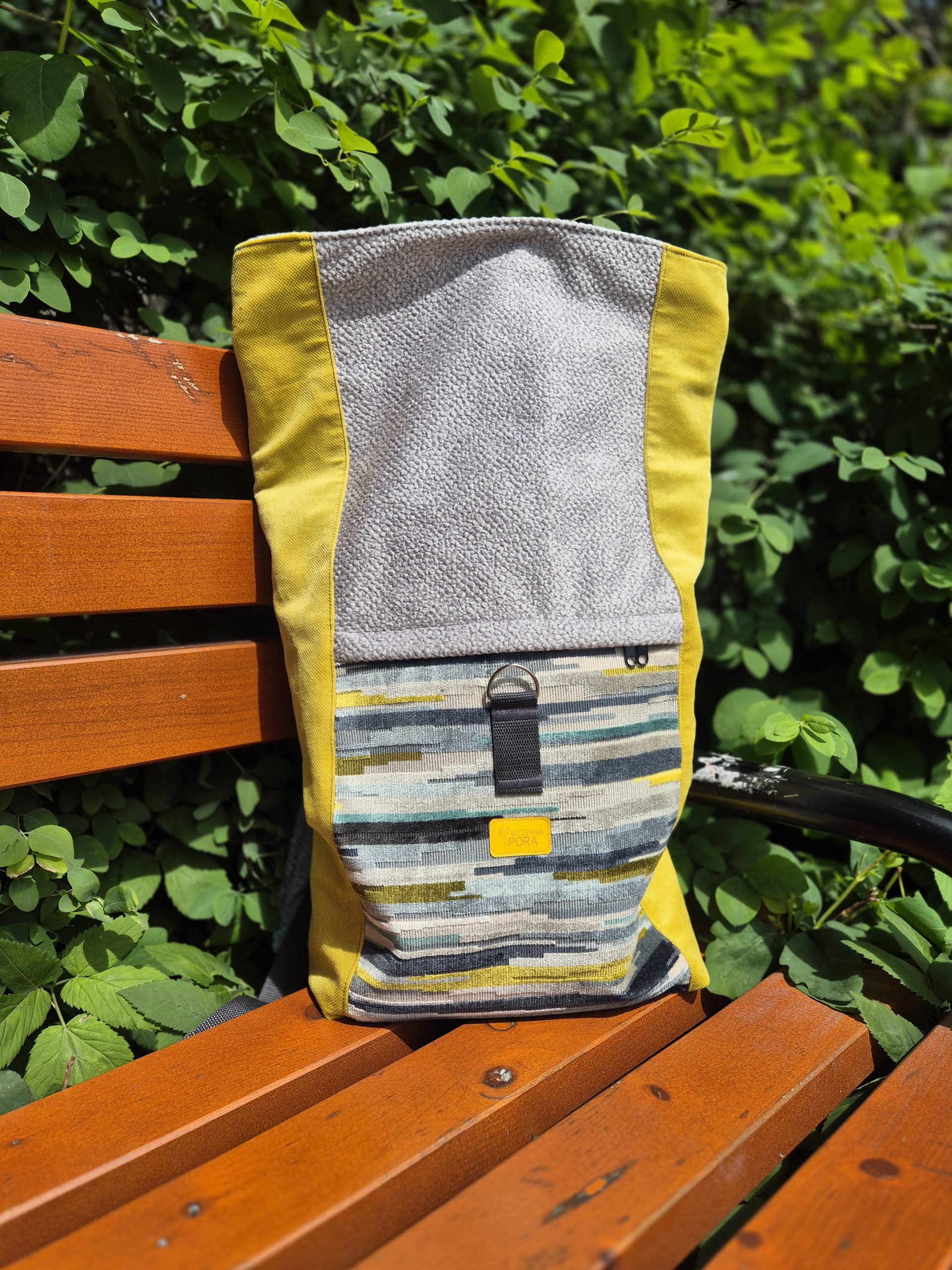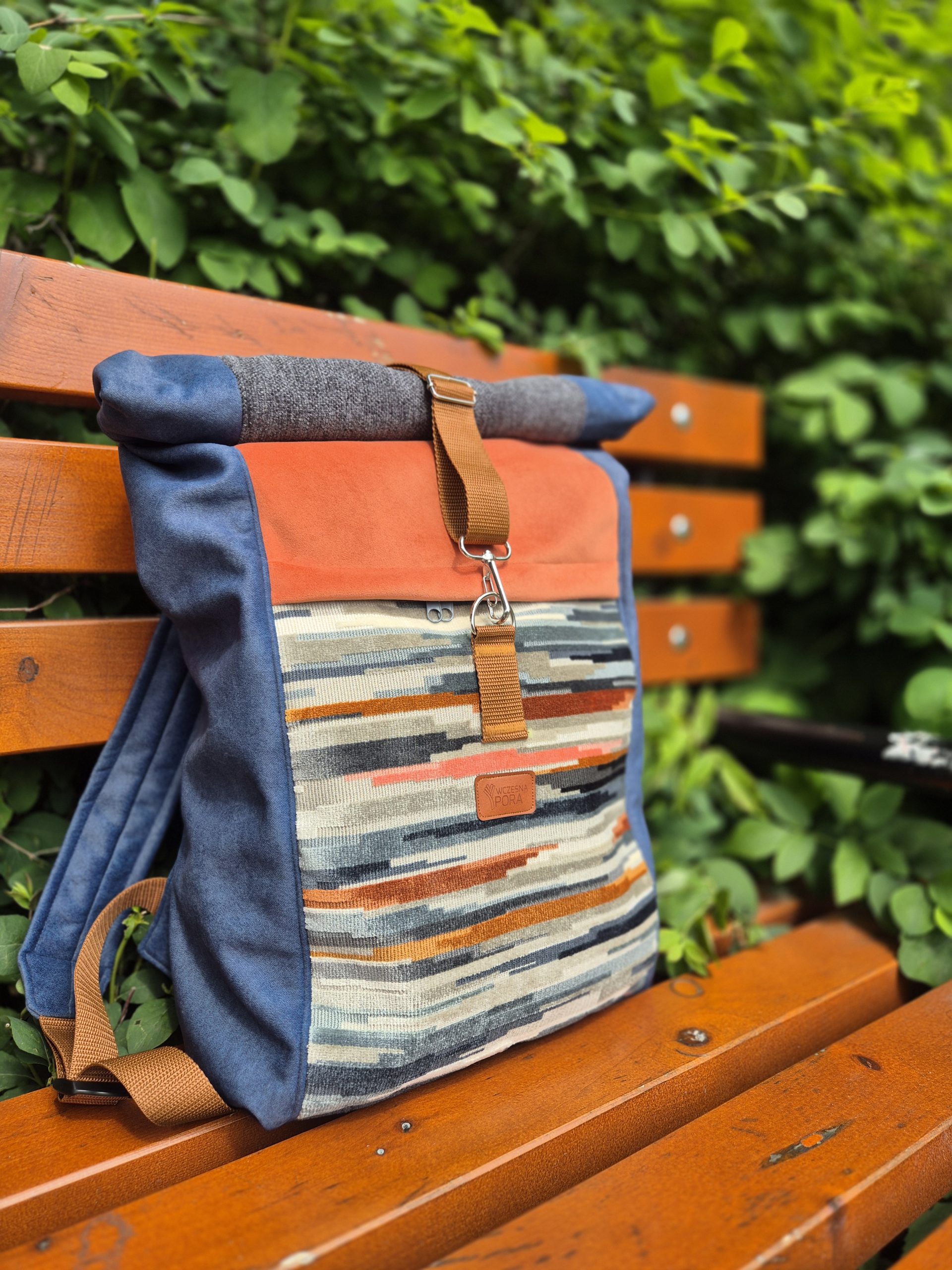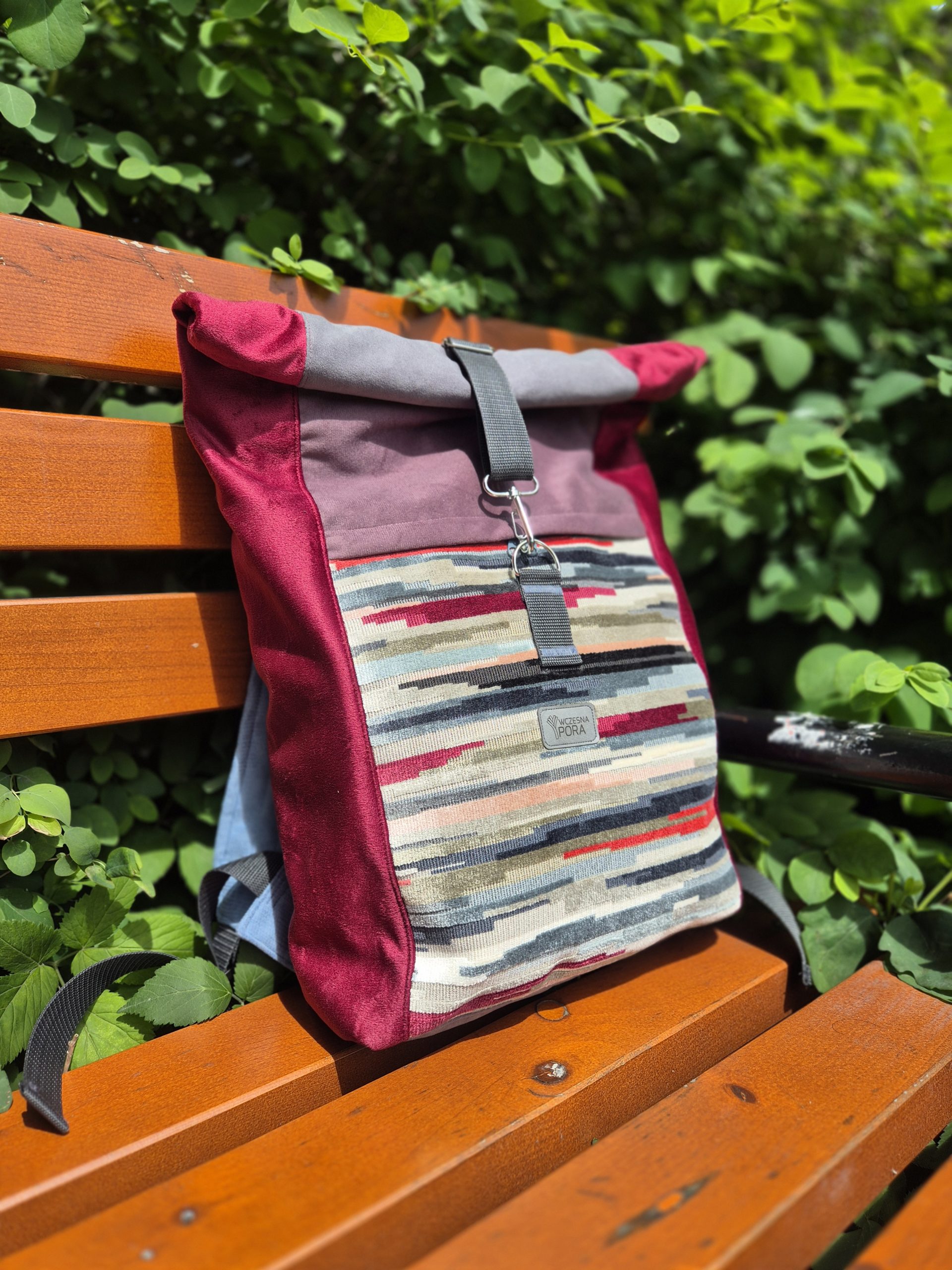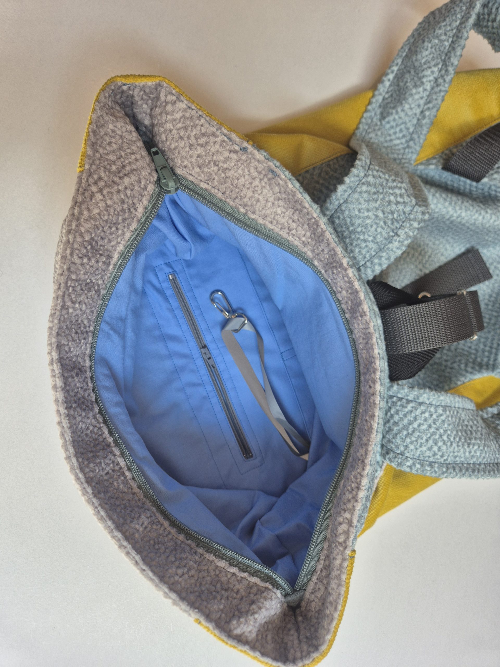 Duży plecak kurierski uszyty z welurów obiciowych w kolorach – miodowym, miętowym i szarym.