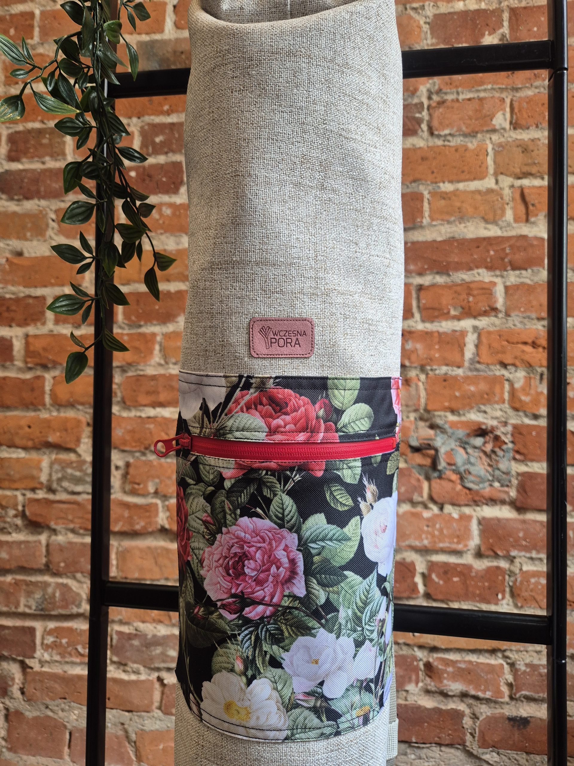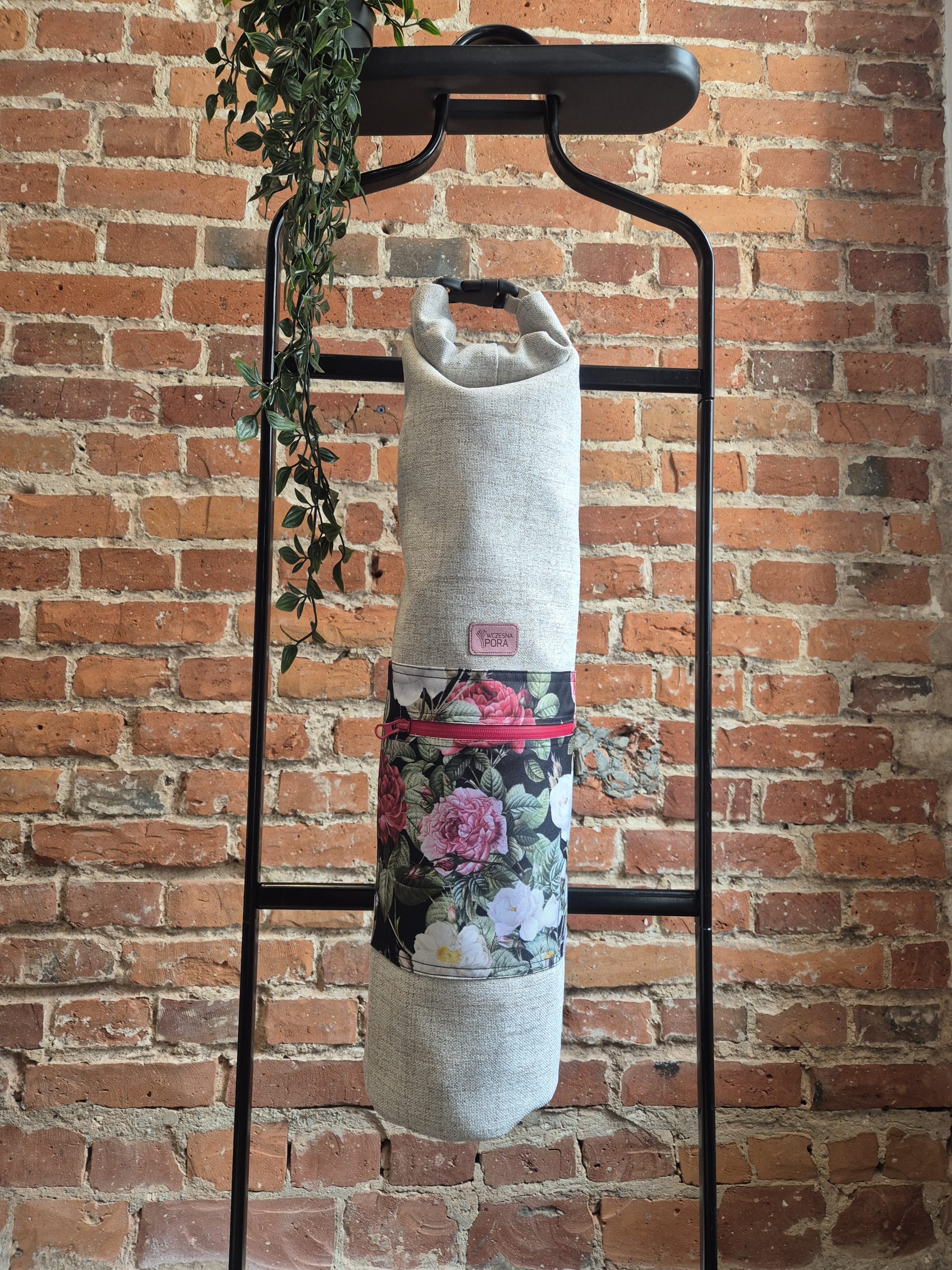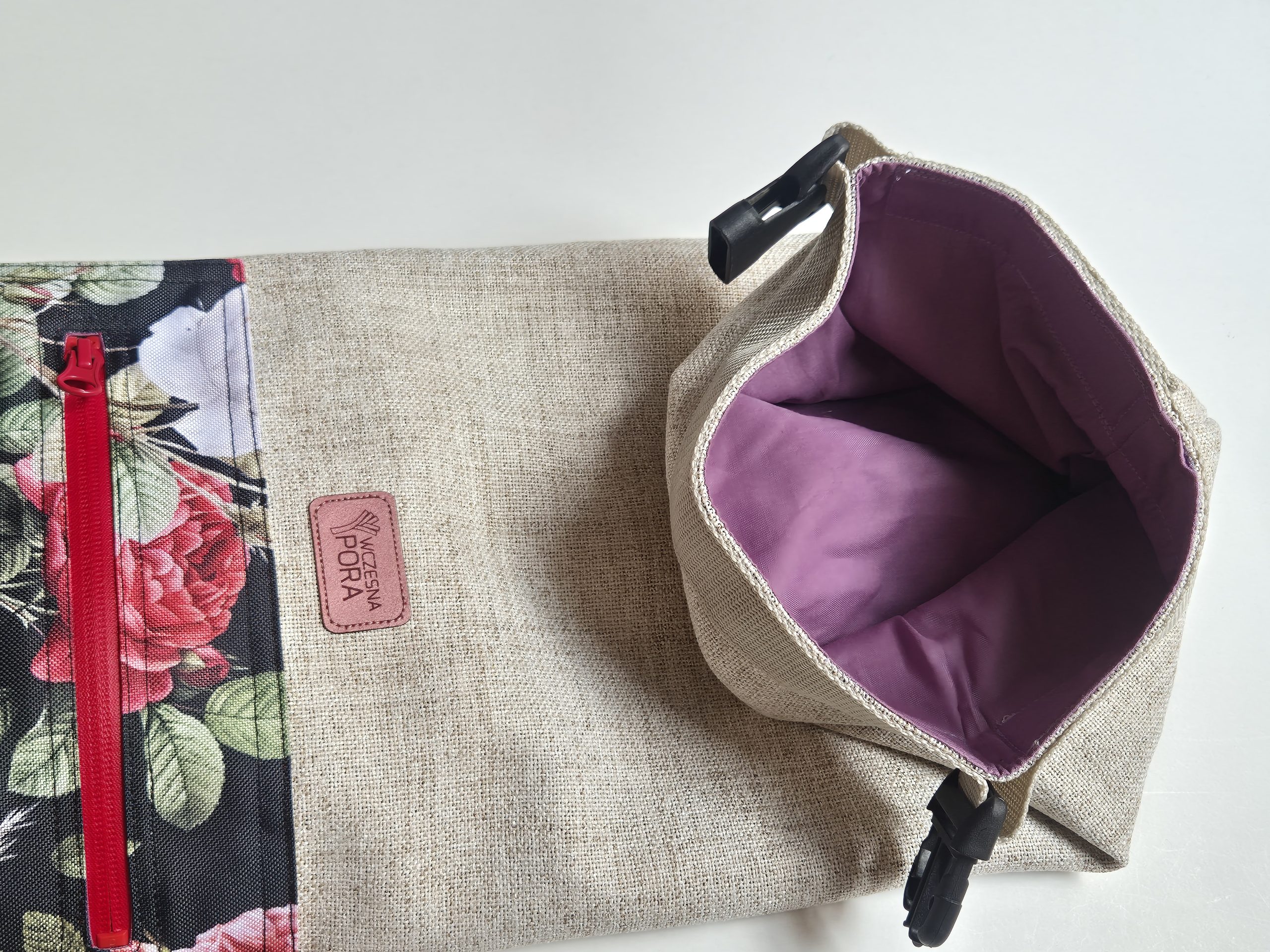 Na zewnątrz wodoodporna kieszonka w róże na czarnym tle zamykana na wodoszczelny suwak.