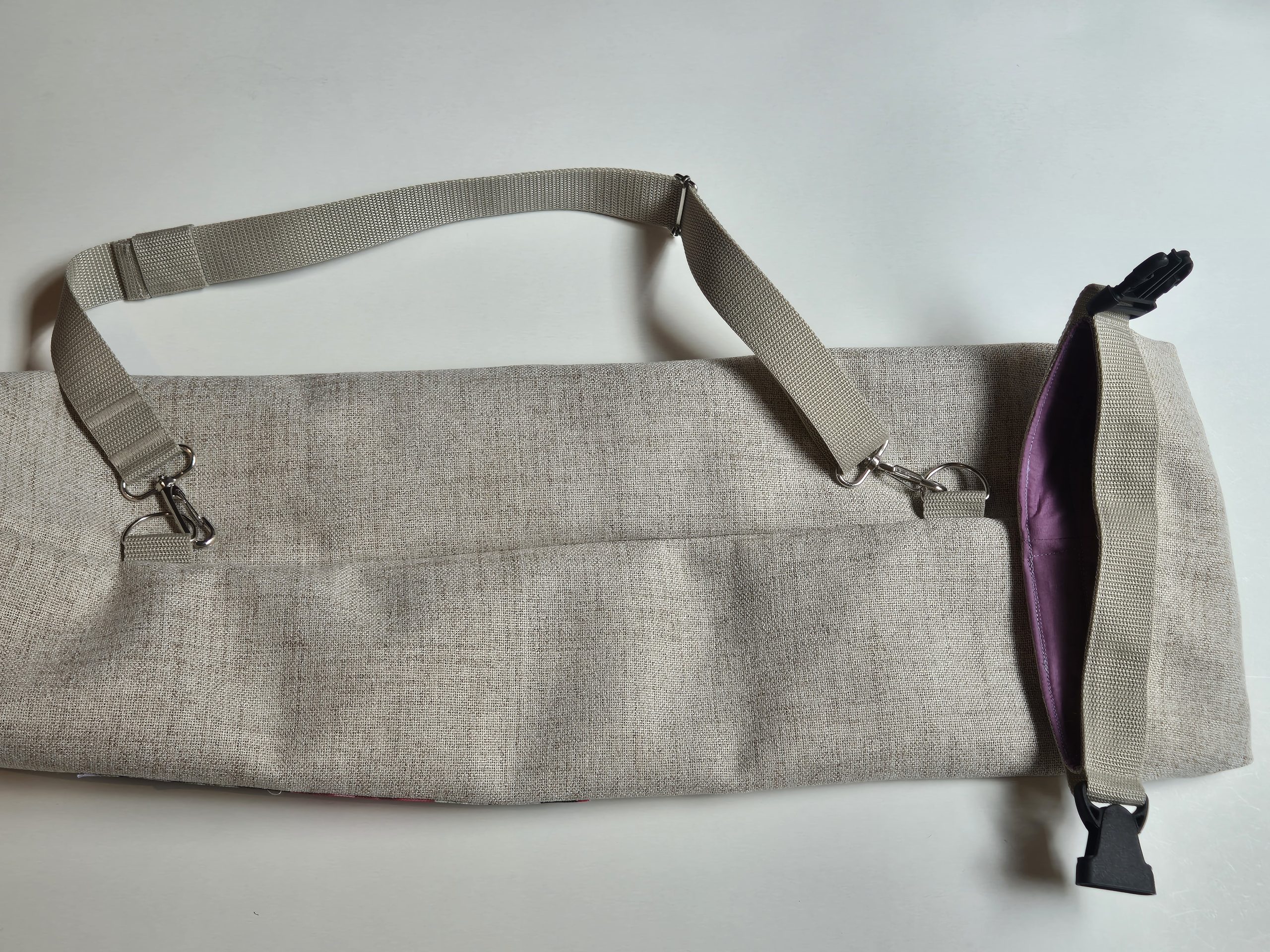 Pokrowiec ma dopinany, regulowany pasek, w kolorze beżowym, dzięki któremu łatwo przenosić matę.
