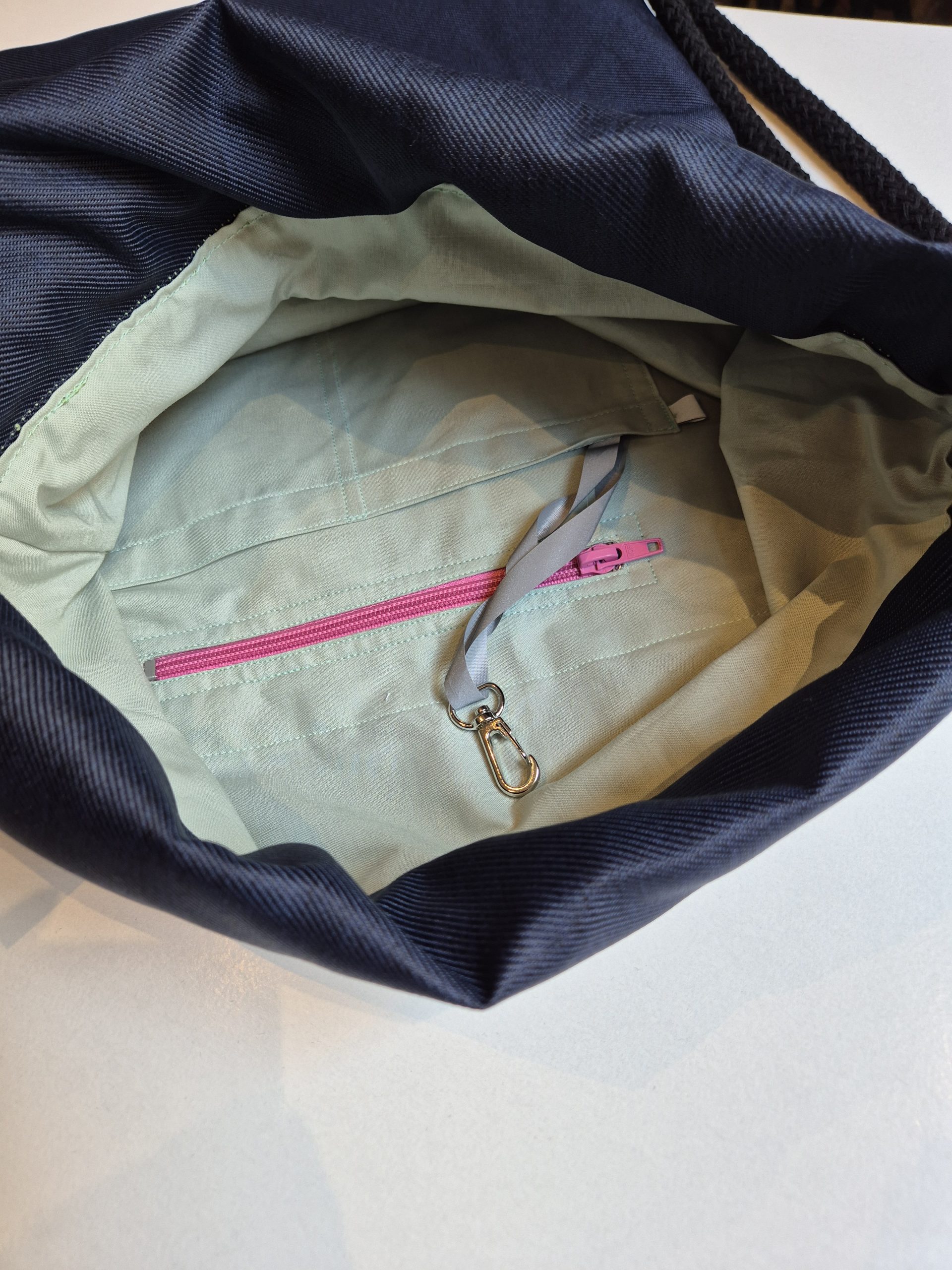 W środku miętowa podszewka + dodatkowe kieszonki. Jedna – bezpieczna – zamykana na suwak, druga – wlotowa, dwudzielna – z przypinką na klucze.