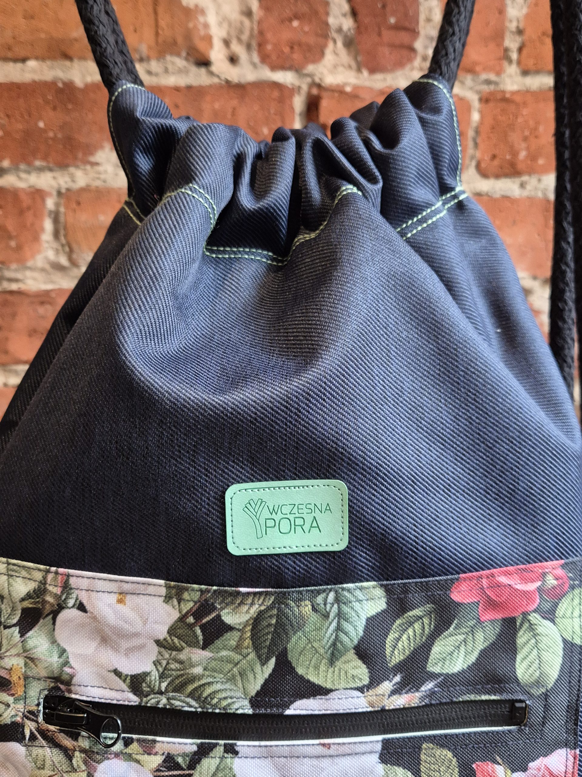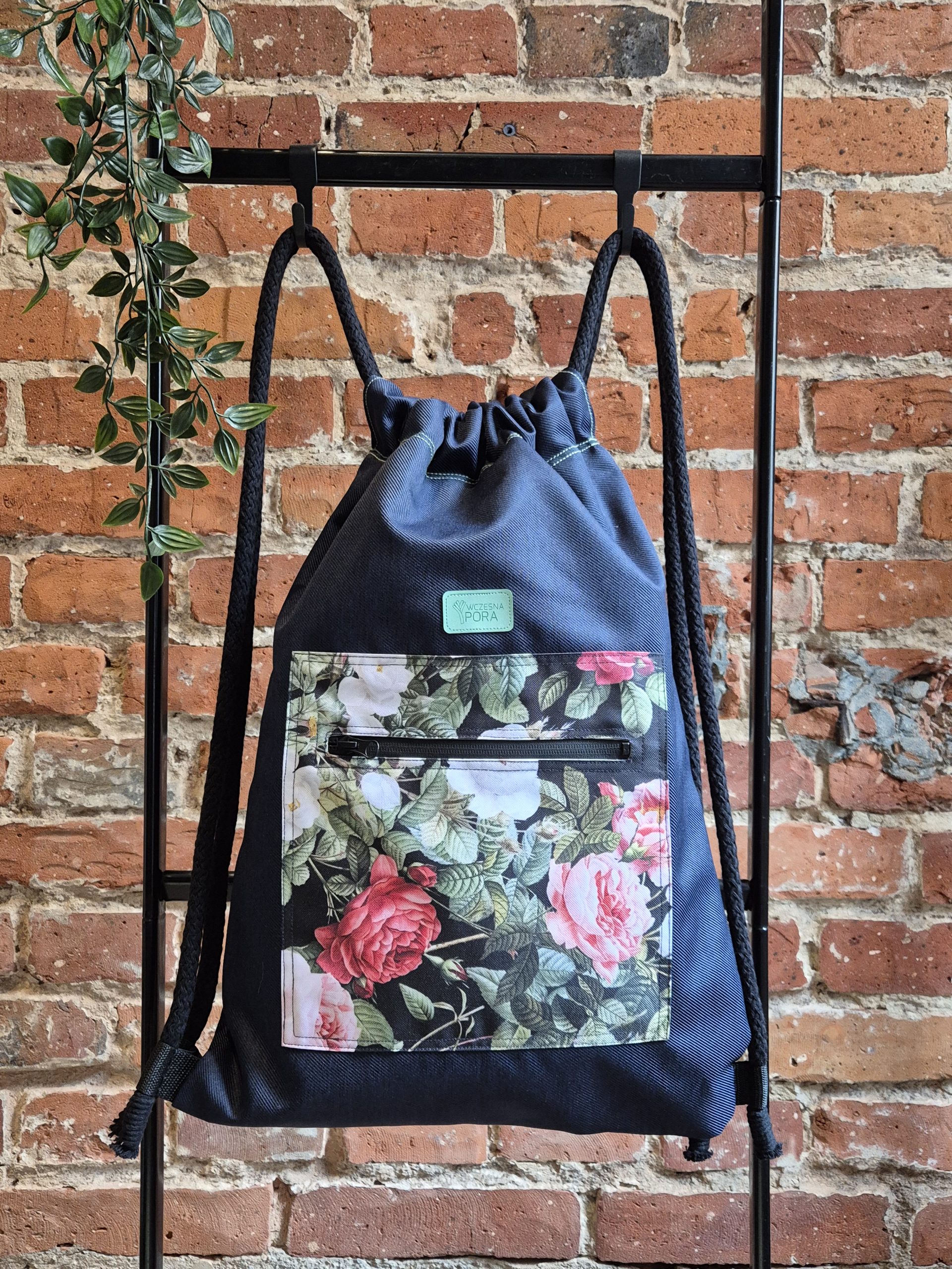 Na zewnątrz kieszonka z poliestru wodoodpornego w kwiaty róże, zapinana na gumowany, wodoodporny suwak.