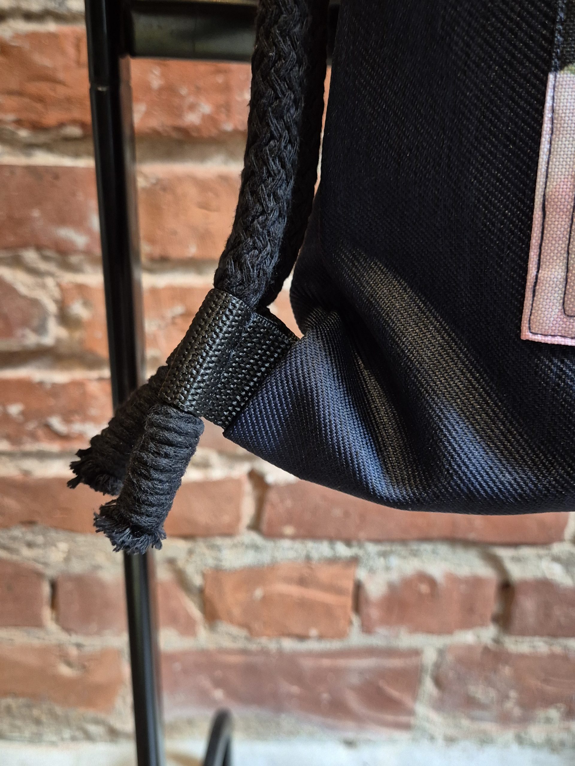 Czarne, grube, bawełniany sznury trzymają czarne, poliestrowe paski.